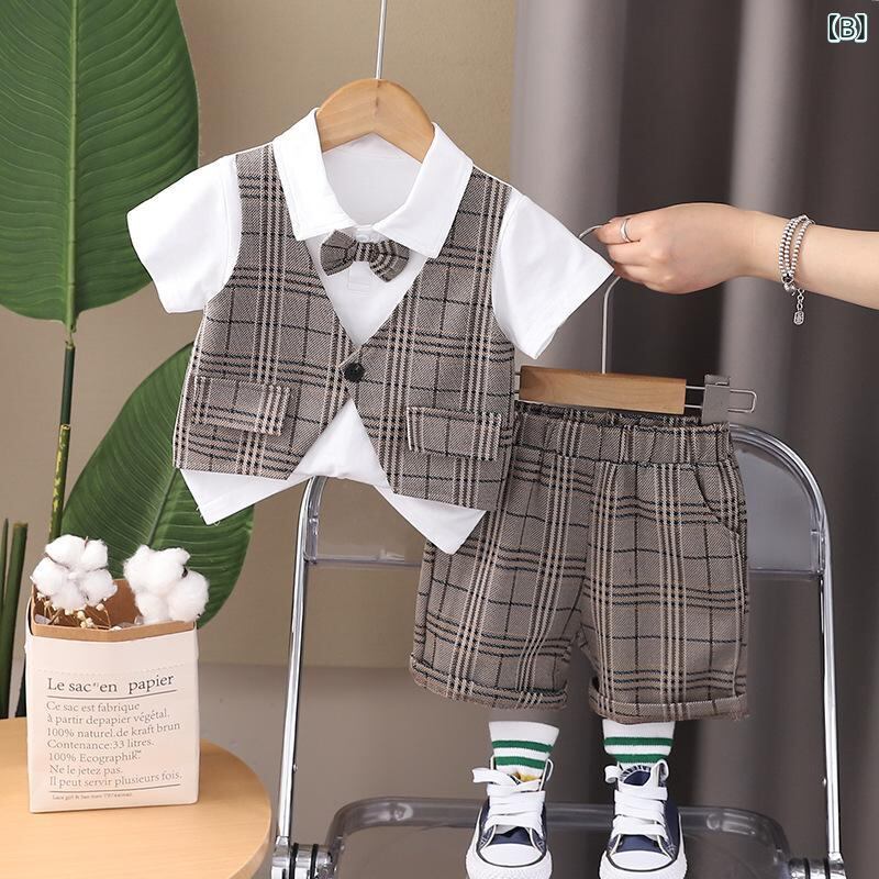 キッズ フォーマル スーツ 半袖 短パン 上下セット 男の子 夏物 子供 服 コットン 格子柄 ストライプ 薄手 普段着 部屋着