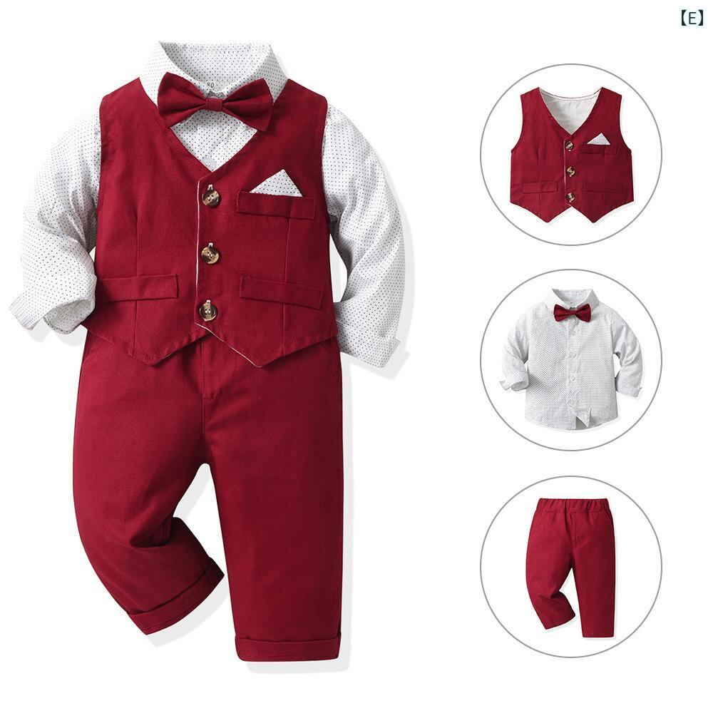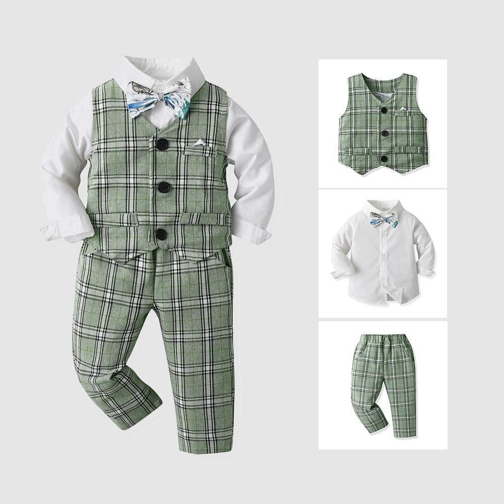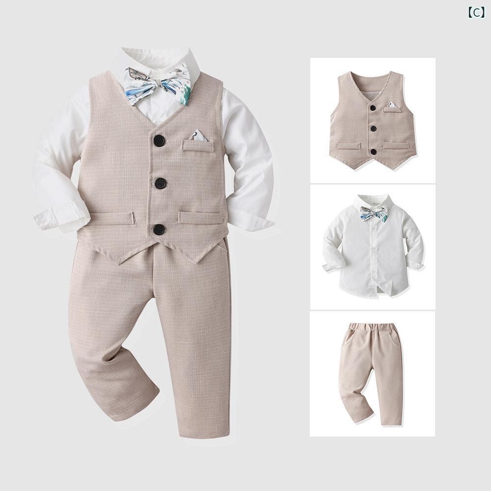 キッズ フォーマル スーツ 男の子 長袖シャツ ベスト パンツ 3点セット 子供 ピアノ 発表会 演奏会 入園式 結婚式 グレー 杏色 浅緑 クリスマス