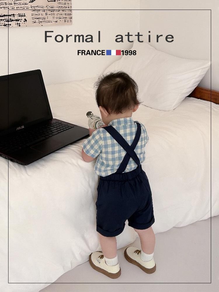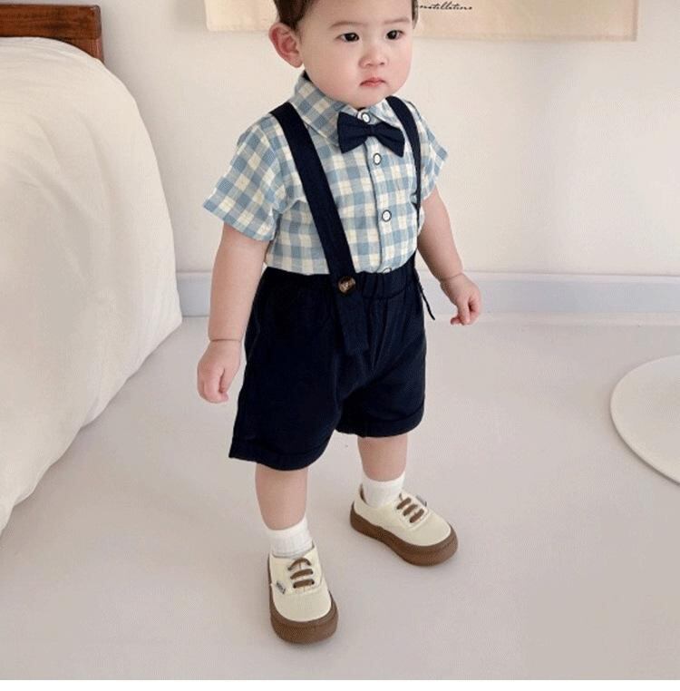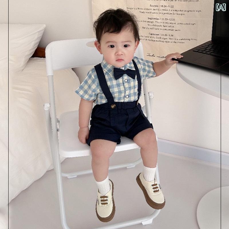 キッズ フォーマル スーツ 男の子 夏用 半袖シャツ ハーフパンツ 上下セット 子供 紳士風 チェック柄 結婚式 誕生日 初節句 70 80 90