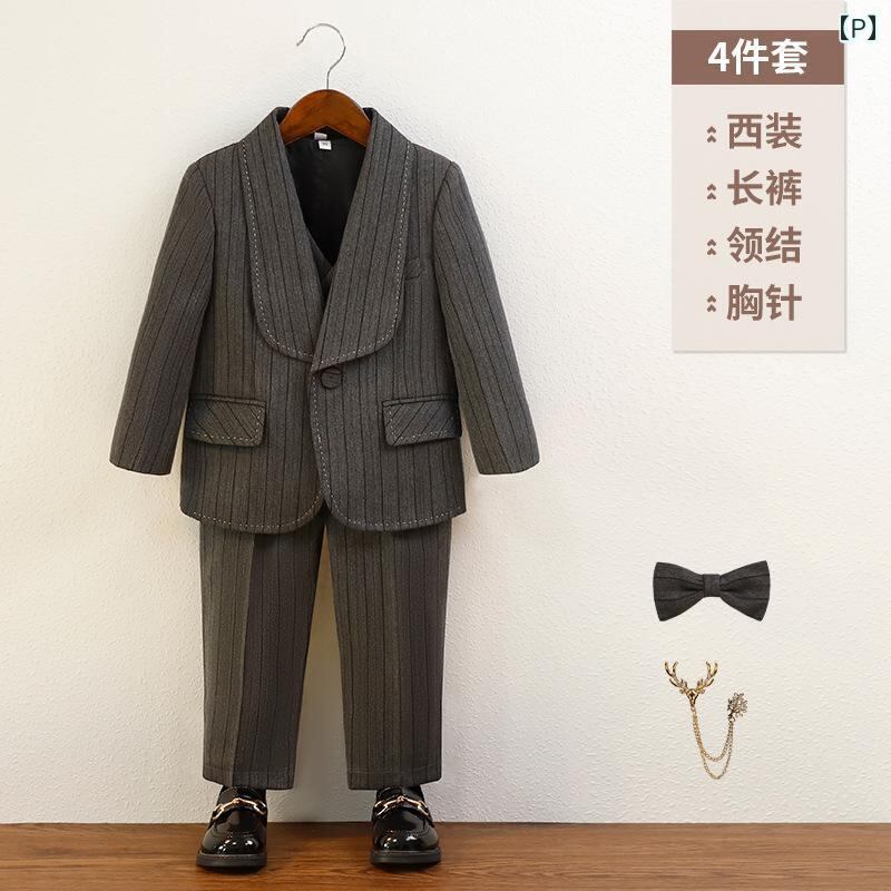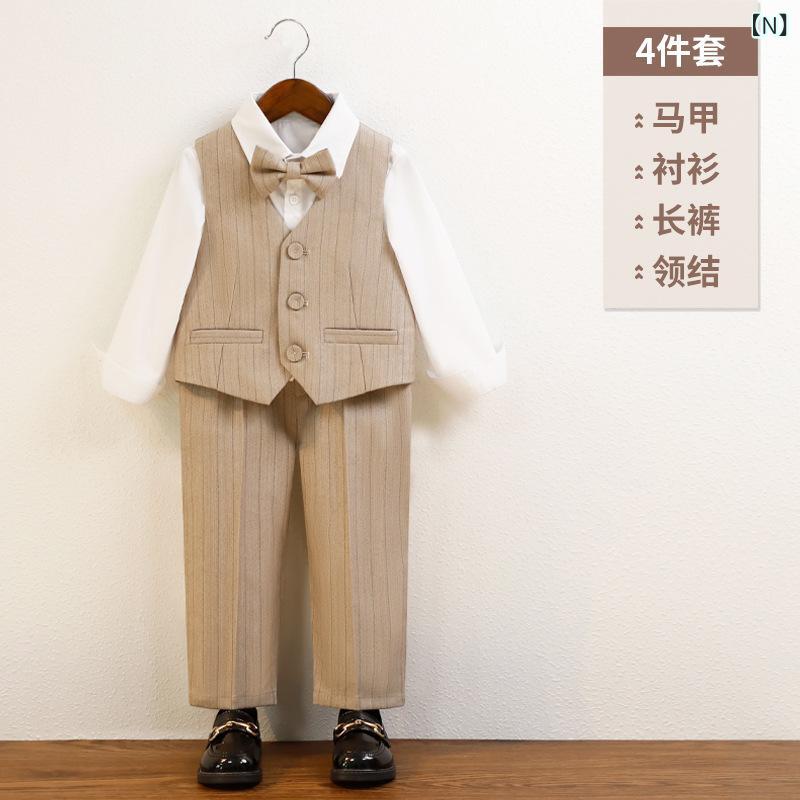 子供用 フォーマル スーツ 男の子 5点セット (ジャケット ベスト パンツ 蝶ネクタイ ブローチ) ストライプ柄 結婚式 発表会 演奏会 七五三 入園式 卒園式 入学式 卒業式 英国風