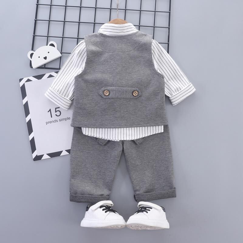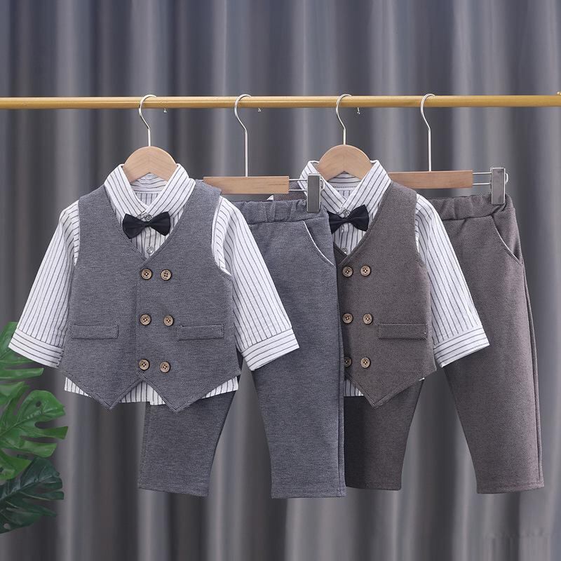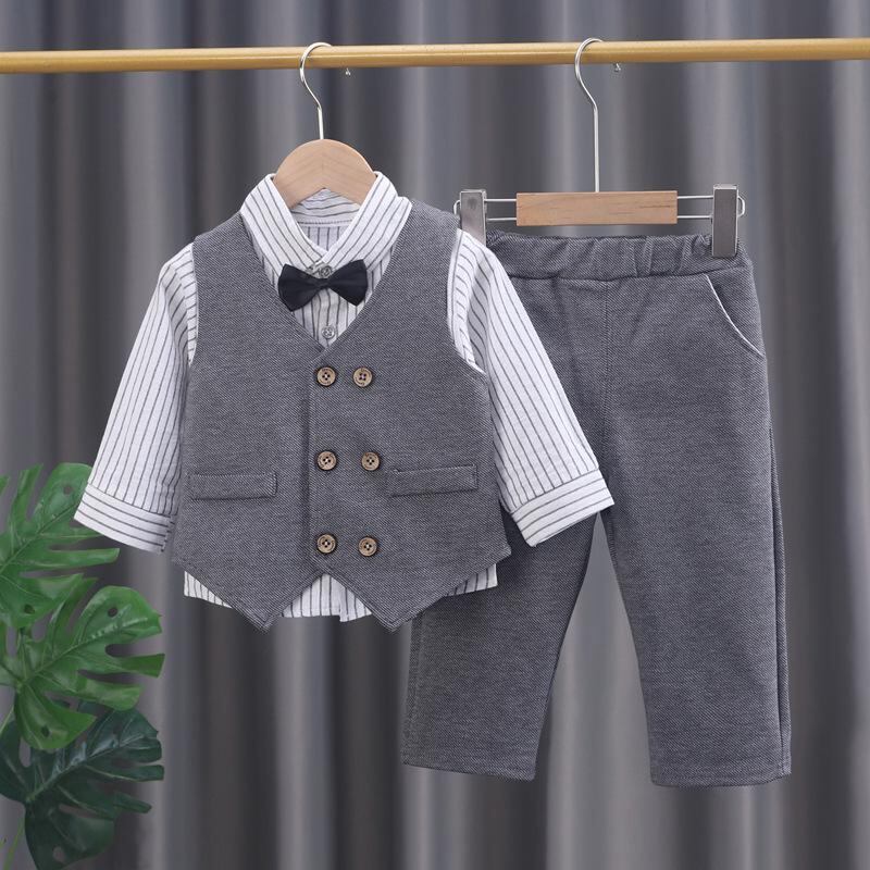 ベビー フォーマル スーツ 3点セット 春秋 長袖 ストライプシャツ ベスト ショートパンツ グレー 紳士風 セレモニー 結婚式 誕生日 記念日