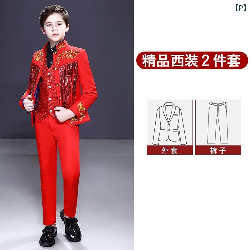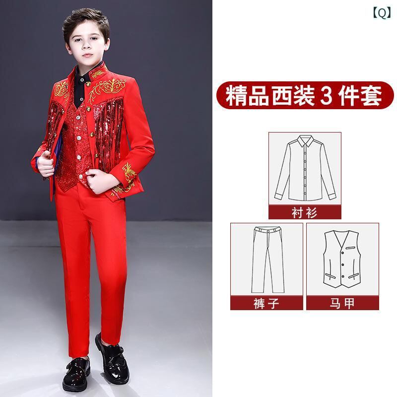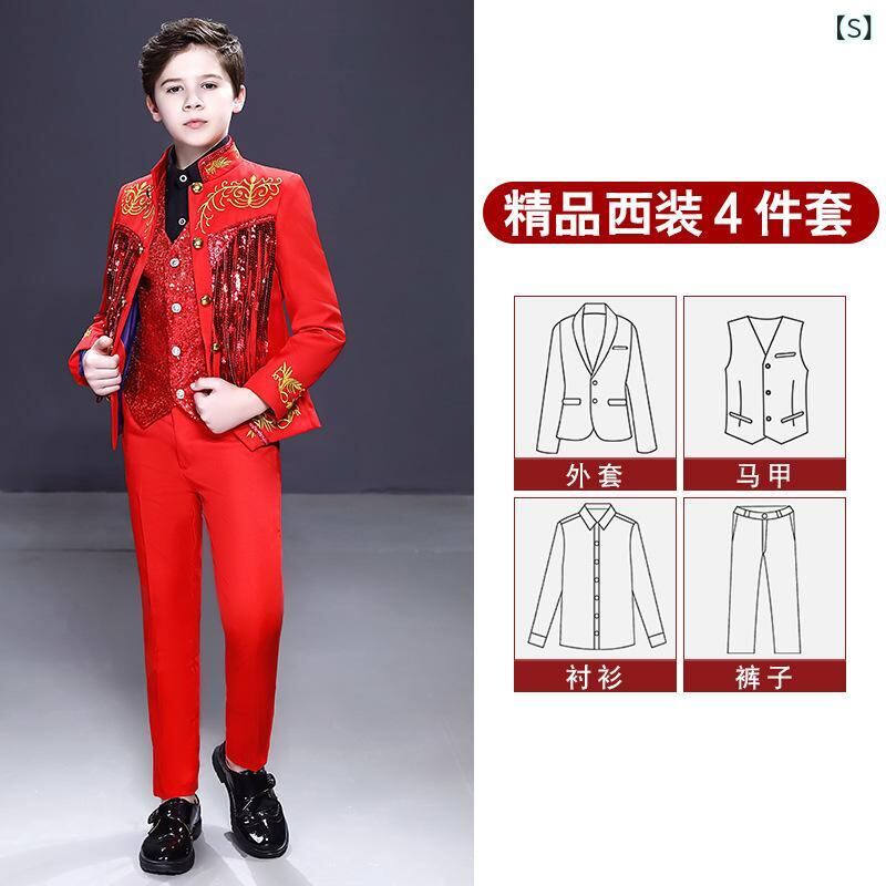 キッズ フォーマルスーツ 男の子 子供 3点セット (ジャケット、シャツ、パンツ) ショー モデル 衣装 発表会 結婚式 舞台 演出 短丈 英国風 ポリエステル イエロー ホワイト レッド