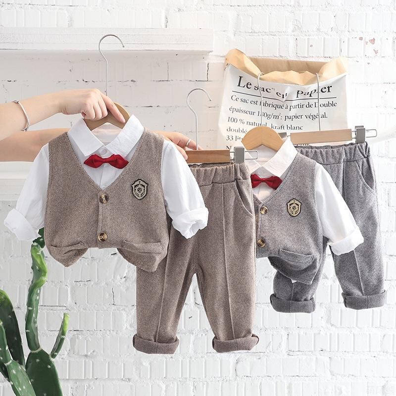 子供用フォーマルスーツ 男の子用ベストセット 子供服 長袖シャツ 蝶ネクタイ付き 長ズボン 上下3点セット 入園式 卒園式 結婚式 発表会 七五三 グレー カーキ | Kneebaファッションショップ