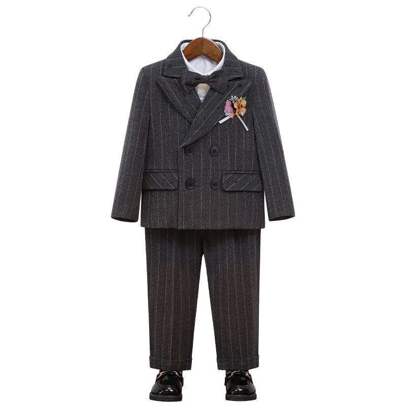 キッズ フォーマルスーツ 男の子 ストライプ柄 ジャケット ベスト パンツ 蝶ネクタイ ブローチ 5点セット 6点セット 発表会 演奏会 結婚式 グレー