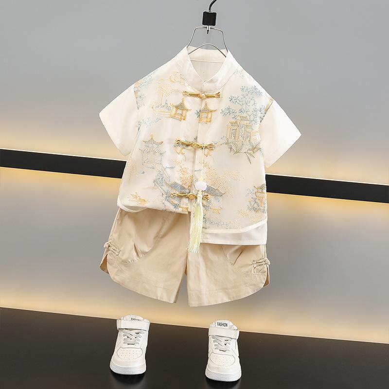 子供用セットアップ 男の子用 半袖シャツ & ハーフパンツ 唐装風 中華風 夏用 綿混紡 普段着 部屋着