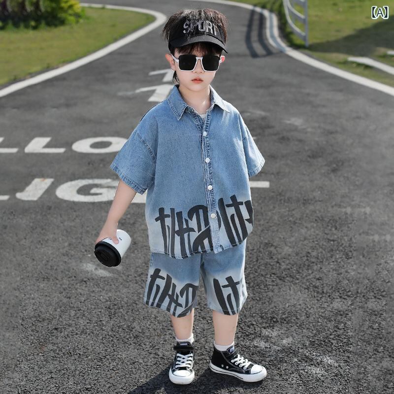 キッズ セットアップ 子供服 男の子 シャツ & デニムパンツ 2点セット 夏 薄手 半袖 カジュアル ボーイズ 上下セット