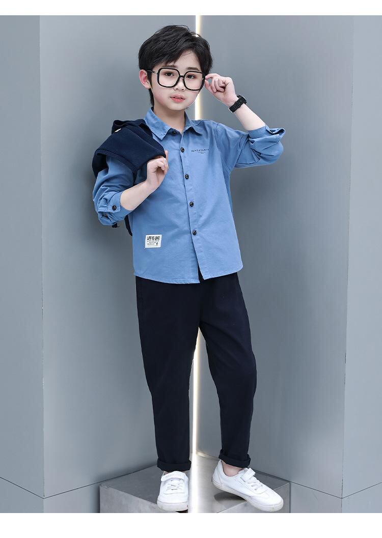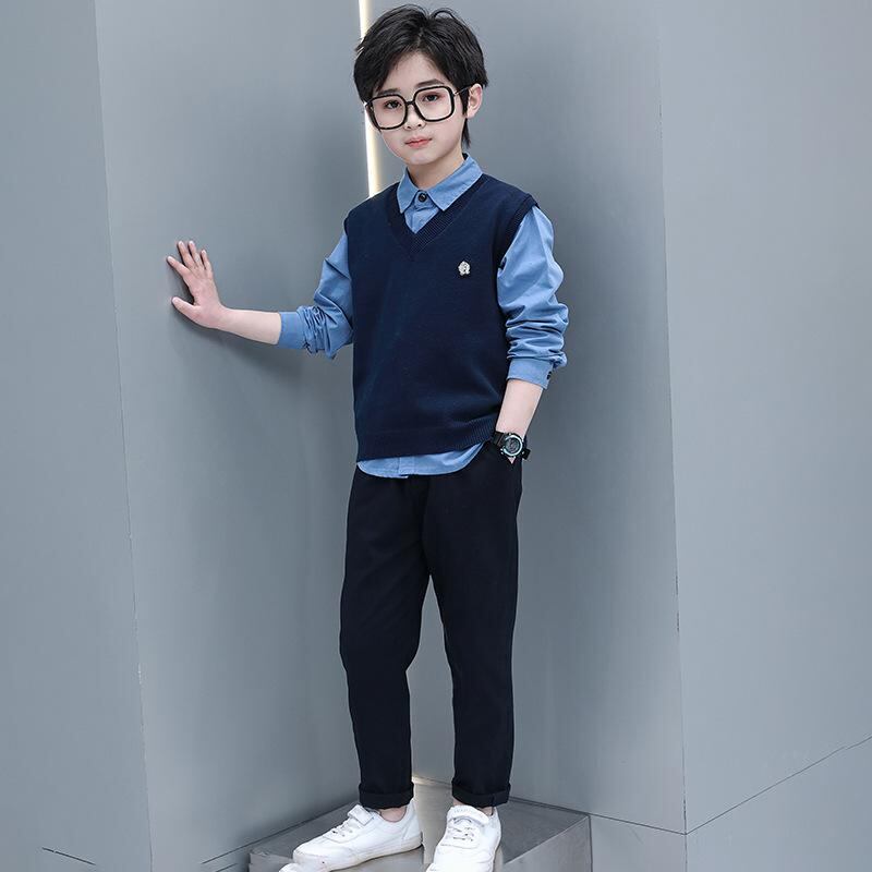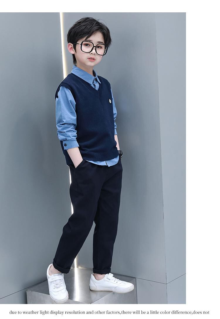 キッズ フォーマルスーツ 3点セット 男の子 子供服 春秋 セットアップ 発表会 結婚式 卒園式 入学式 長袖シャツ ベスト ロングパンツ 綿100% 紺色