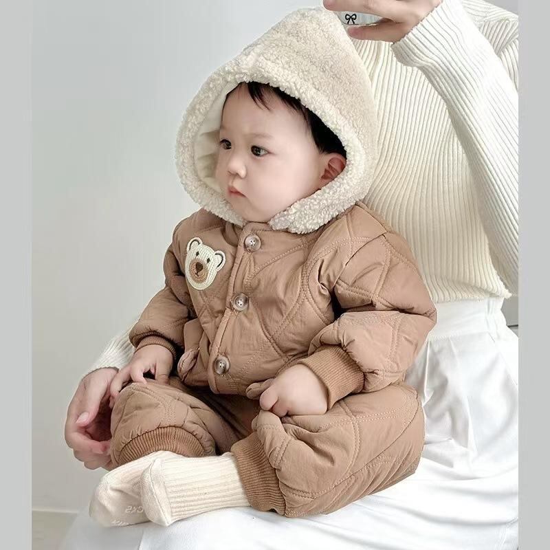 ベビー服 秋冬 キルティング カバーオール 上下セット 厚手 裏起毛 男の子 女の子 かわいい クマ耳 フード付き ズボン 2点セット 80 90 100