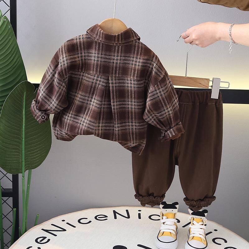 キッズ 男の子 春物 長袖シャツ パンツ 上下3点セット チェック柄 コットン 普段着
