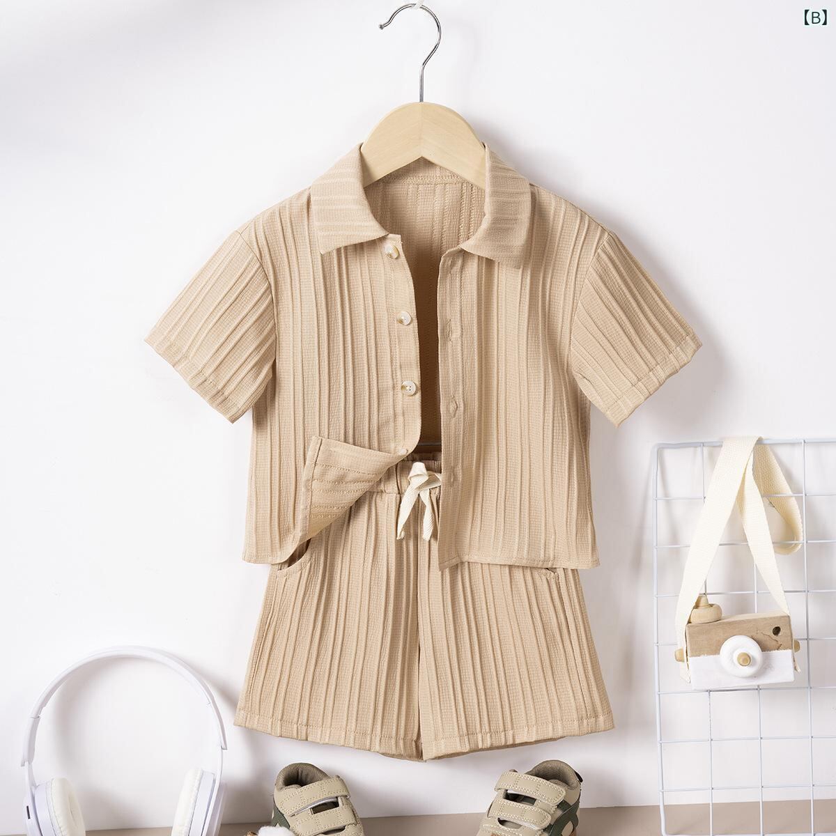 キッズ 男の子用 セットアップ 半袖シャツ 短パン 薄手 無地 100%ポリエステル 90cm 100cm 110cm 120cm グリーン 浅カーキ ブラック ダークグレー 3歳 4歳 5歳 6歳 7歳 8歳