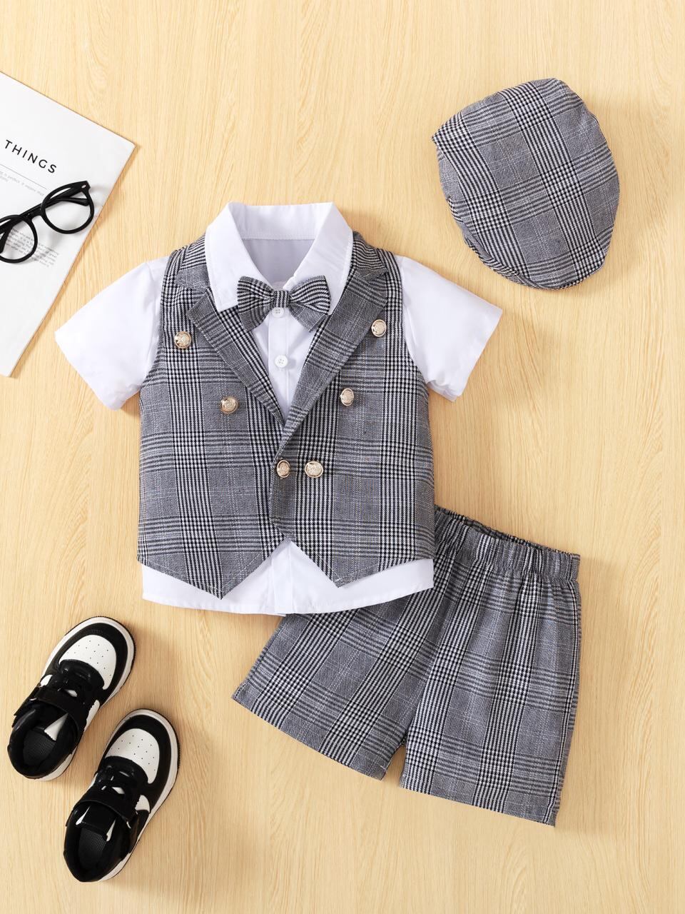 キッズ 男の子 フォーマル スーツ セットアップ グレー 格子柄 ベスト付き 3点セット 英国風 子供服 短袖 短パン 幼稚園 小学生 発表会 結婚式