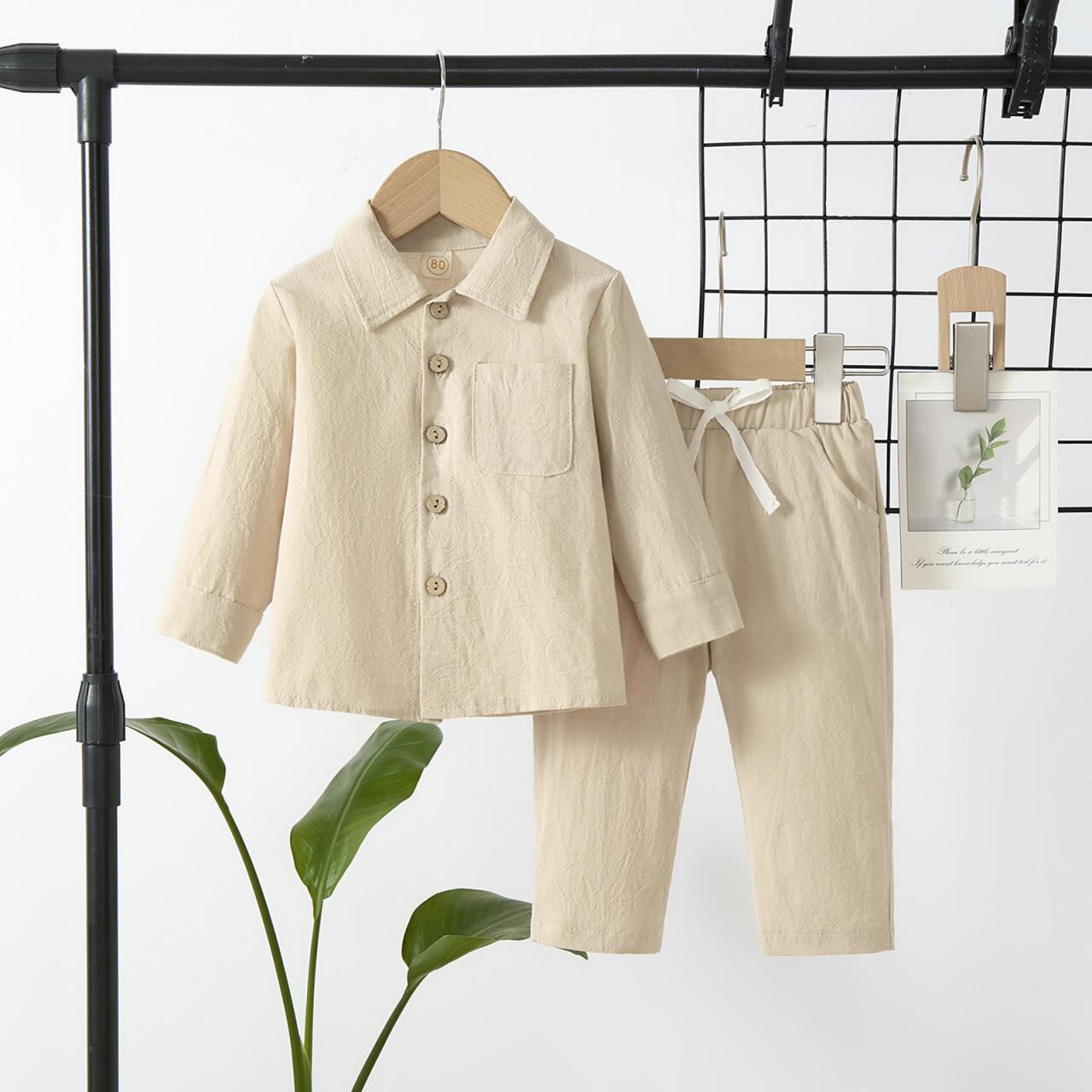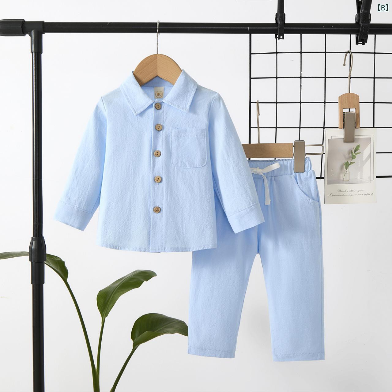 キッズ ボーイズ スーツ 長袖シャツ パンツ 2点セット 春秋物 コットンリネン ポロシャツ風 襟付きシャツ 無地 男の子 乳幼児 普段着 外着 おしゃれ かわいい