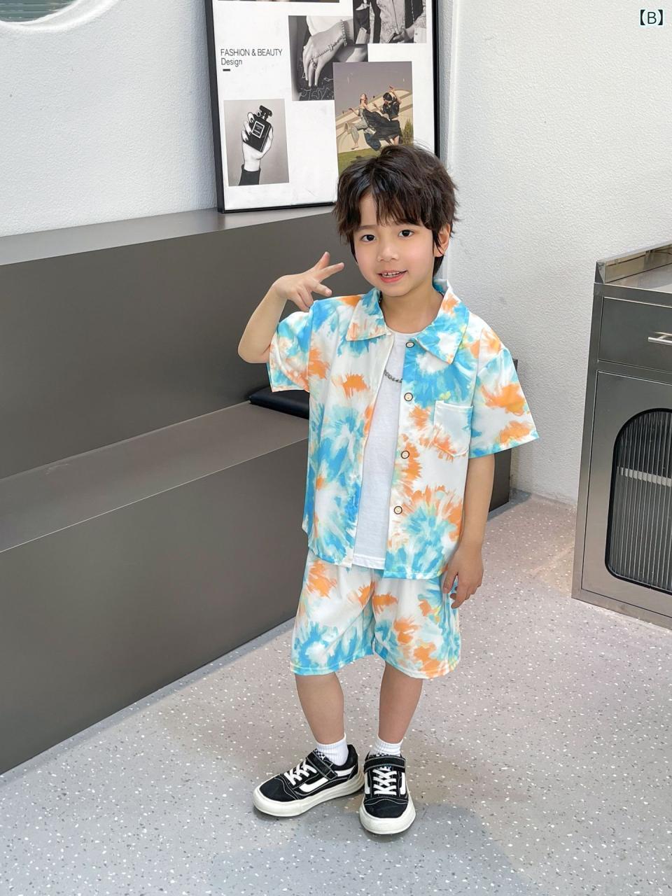 シャツ キッズ 半袖 ショートパンツ 上下セット 子供服 夏 薄手 韓国風 ストライプ 幾何学模様 ポリエステル かわいい 海 普段使い 部屋着