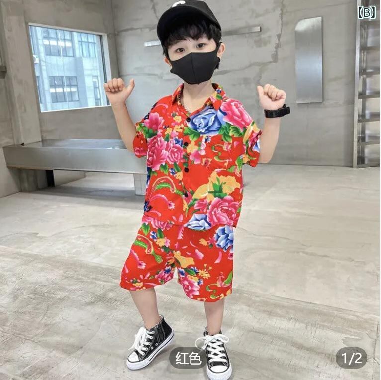 キッズ 男の子 半袖シャツ ショートパンツ セットアップ 子供用 リゾート ビーチウェア アロハシャツ カジュアルパンツ 綿 ポリエステル グリーン レッド