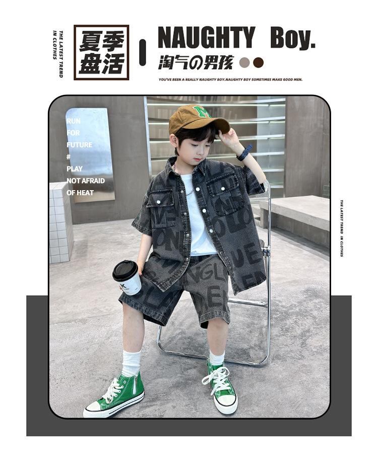 子供服 セットアップ 男の子 デニム 半袖シャツ ハーフパンツ 2点セット 韓国風 子供服 薄手 かわいい 普段着 部屋着 夏 ブラック ブルー 90 100 110 120 130 140 150 160