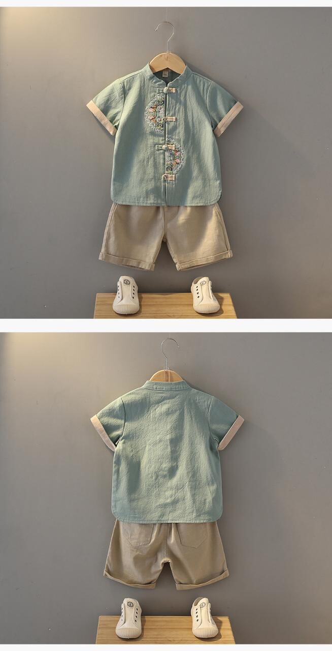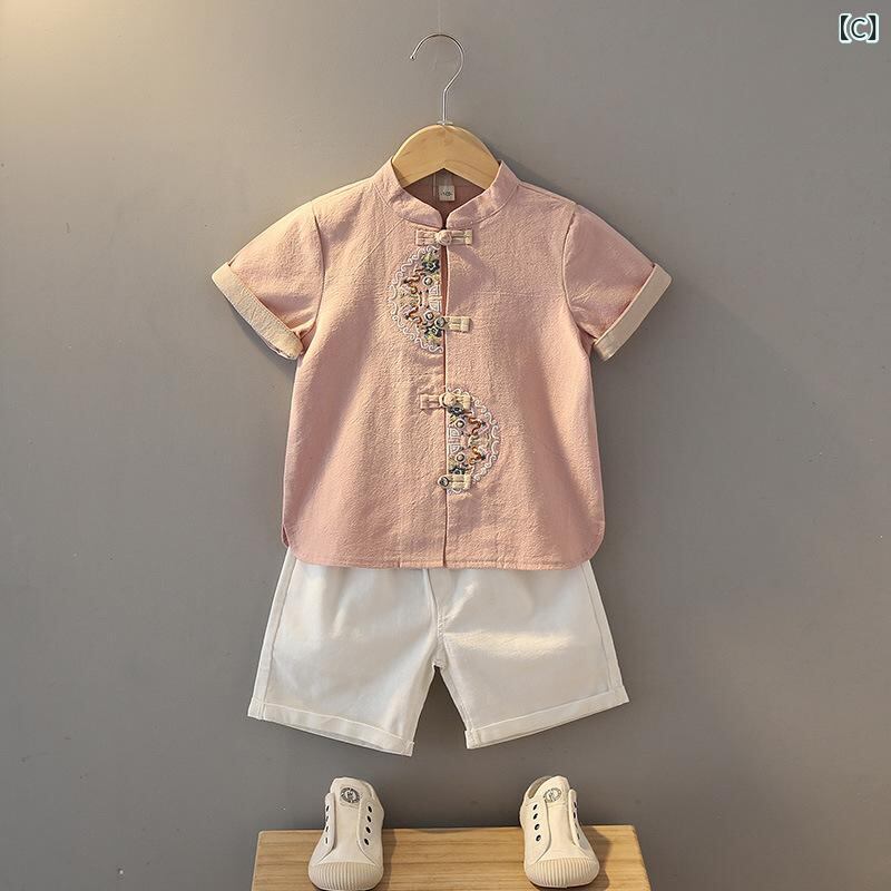 キッズ 男の子 唐装 中華服 セットアップ 上下セット 中国風 子供服 漢服 書生風 コスチューム 衣装 民族衣装 綿 薄手 半袖 短パン ハーフパンツ 夏 90 100 110 120 130 140 150