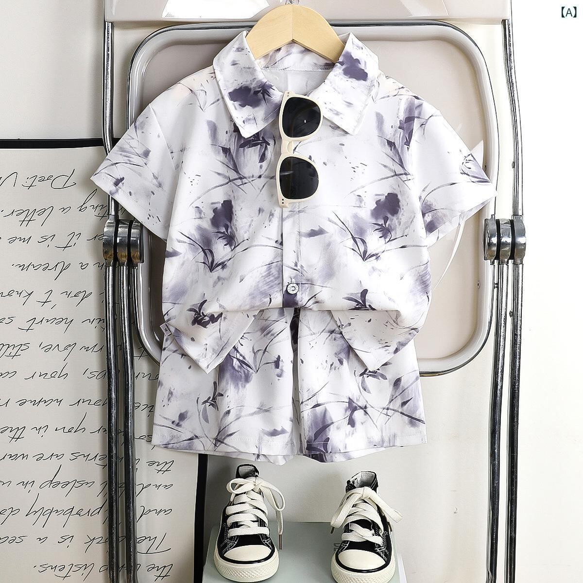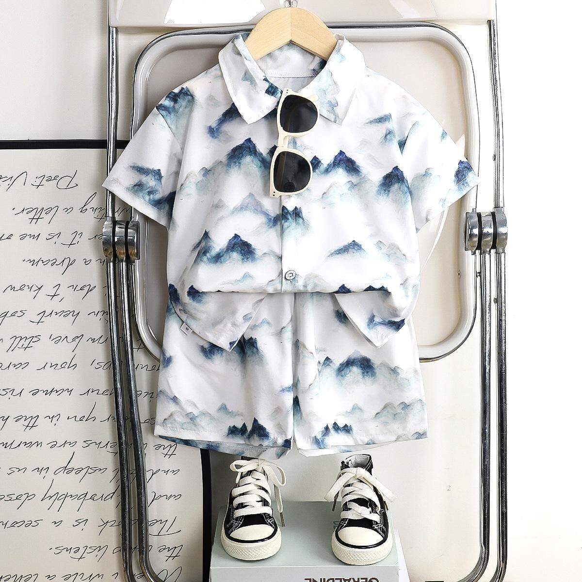子供用セットアップ キッズ 男の子 夏服 半袖 短パン Tシャツ 薄手 ルーズフィット シャツ 水墨 花柄 山水 ブラック 黒 ピンク系 100cm 110cm 120cm 130cm 140cm 150cm