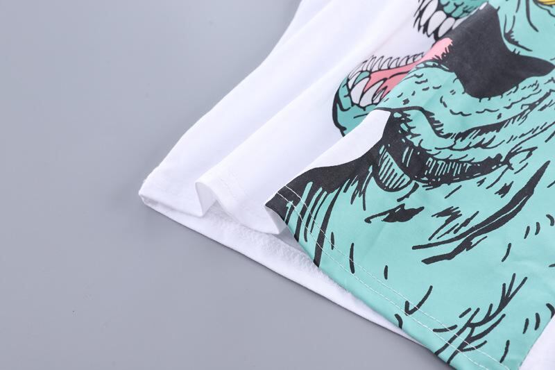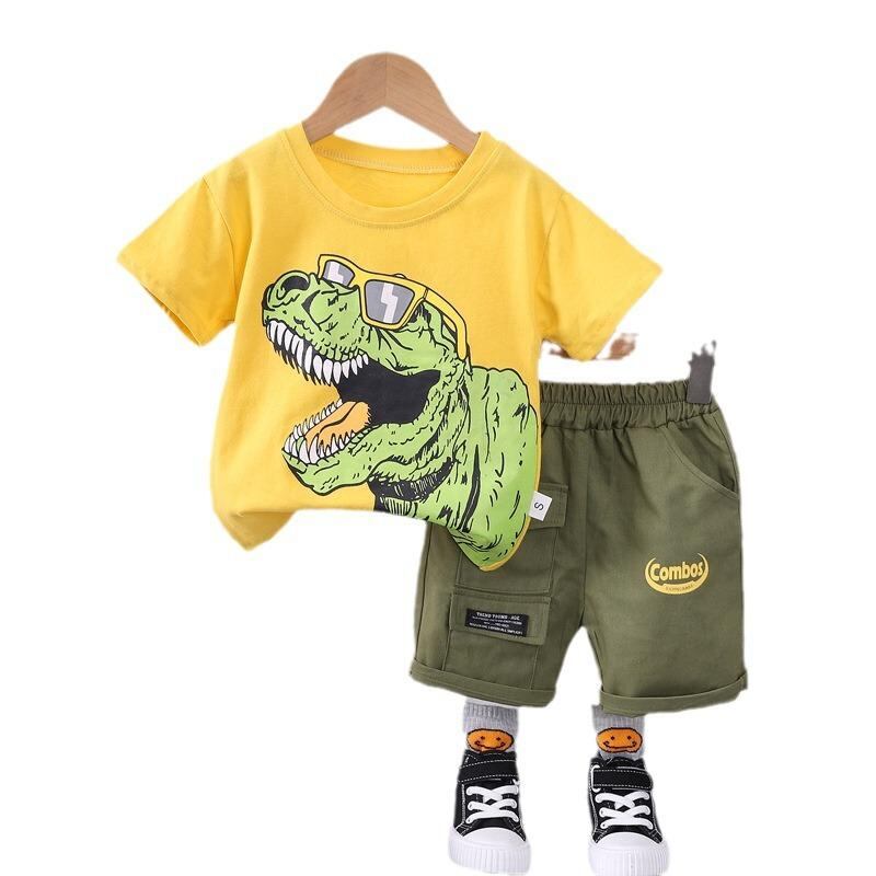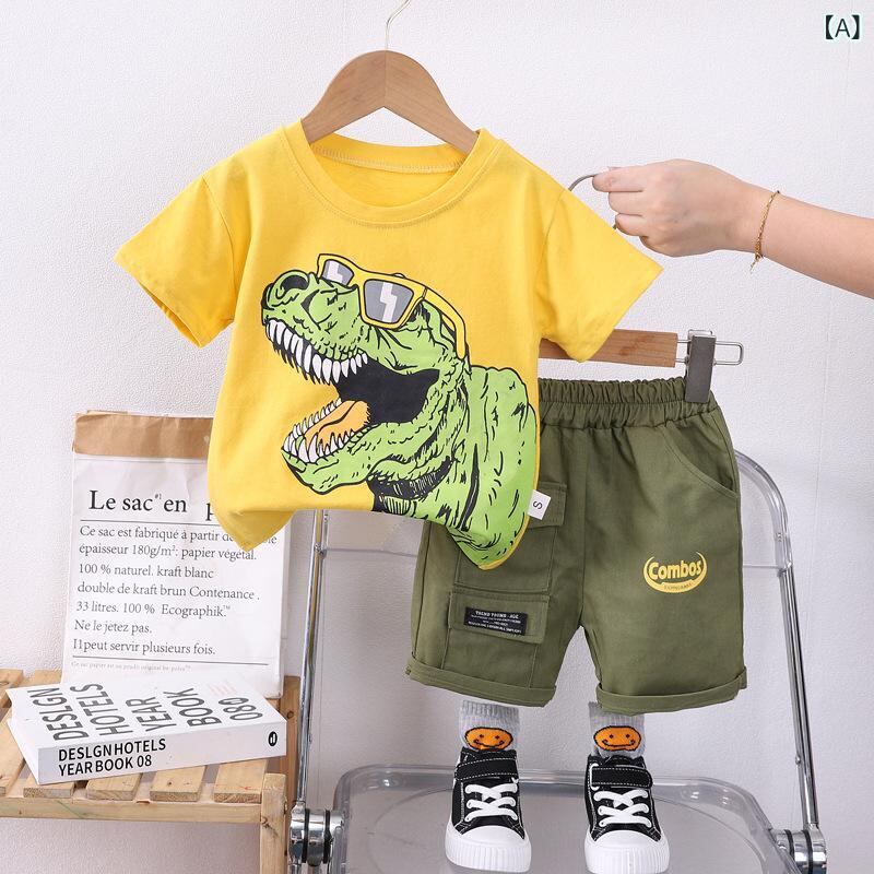 子供用Tシャツ 短パン 上下セット 男の子 半袖 半ズボン カートゥーン 恐竜柄 綿 薄手 幼児 普段着 ルームウェア かわいい 80 90 100 110 120 黄色 白