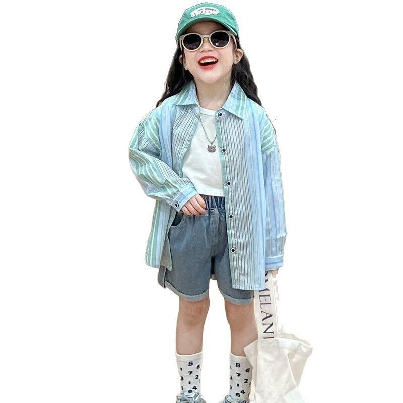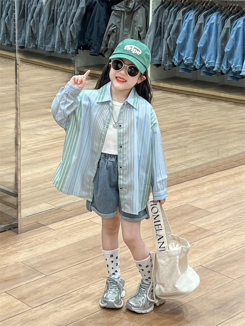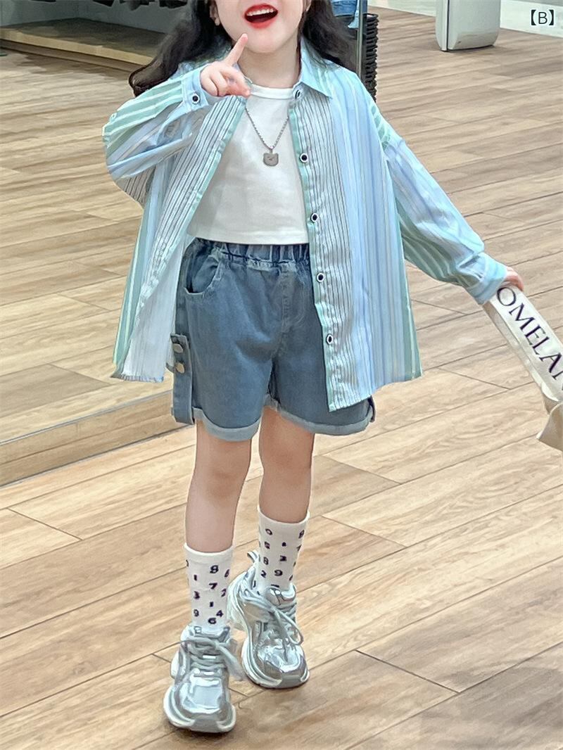 子供服 セットアップ 長袖シャツ デニムショートパンツ 3点セット ストライプ柄 春秋 薄手 男女兼用