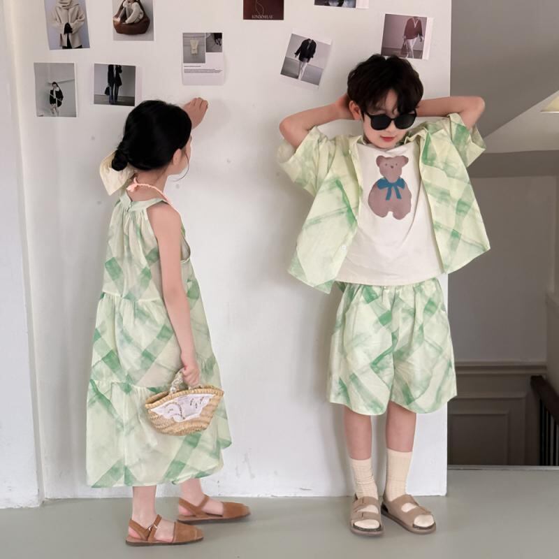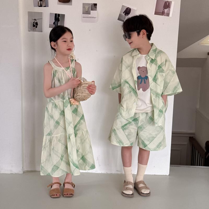 子供服 夏 セットアップ 格子柄 半袖シャツ 吊りスカート 2点セット リゾート 姉弟 兄弟 姉妹