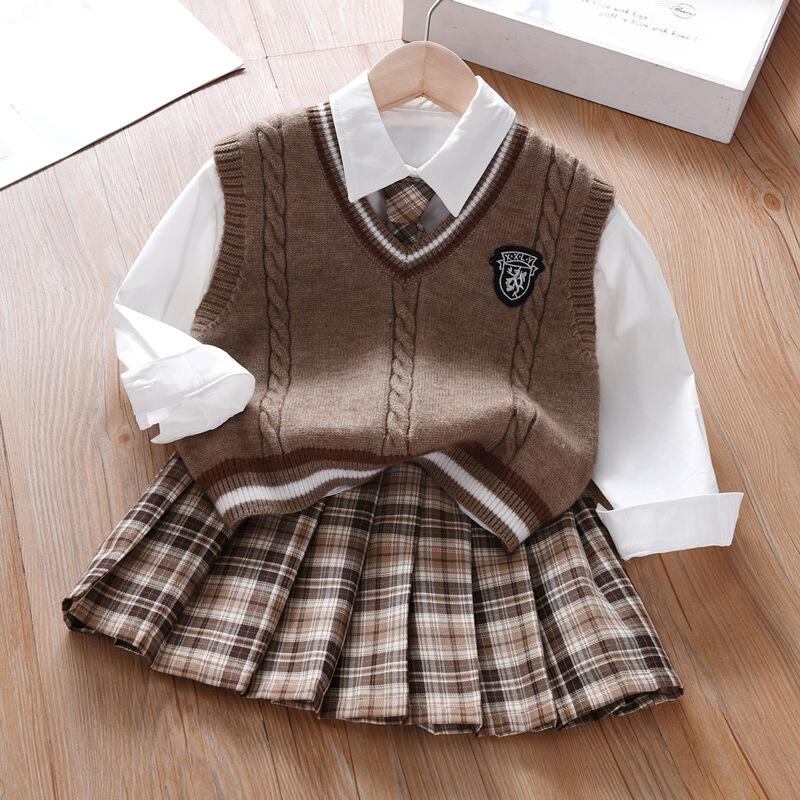 子供服 フォーマル セットアップ 秋冬 子供用 スクールユニフォーム 4点セット:ベスト シャツ 襟飾り付き 短スカート 学生制服 小学生 中学生 男女兼用 綿100% 110cm 120cm 130cm 140cm 150cm 160cm