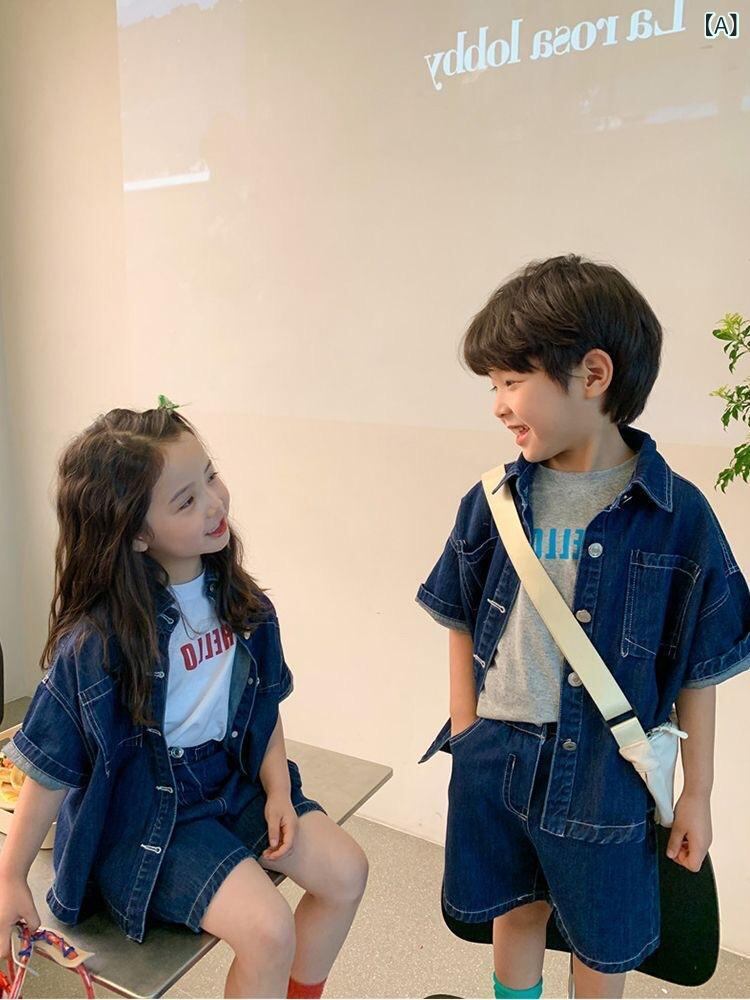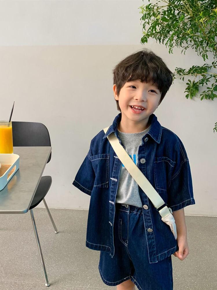 子供服 夏物 パンツセット 男女兼用 デニムシャツ ショートパンツ 上下セット 薄手 90cm 100cm 110cm 120cm 130cm 140cm 150cm 160cm 綿
