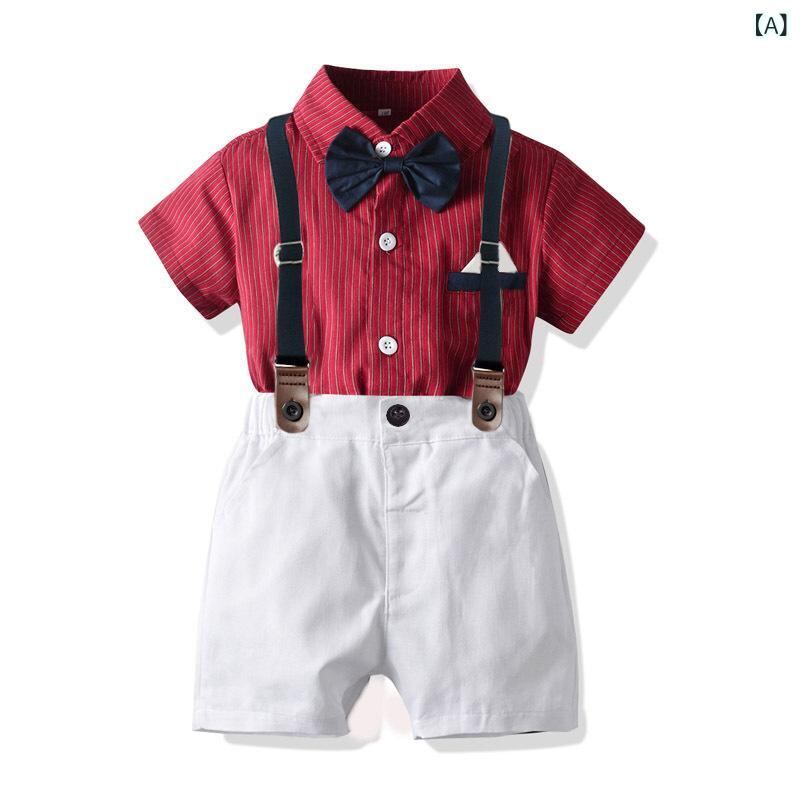 キッズ フォーマル スーツ 男の子 夏物 半袖シャツ ハーフパンツ 上下セット 子供 紳士服 蝶ネクタイ付き 赤色 ストライプ柄 コットン 背広風 お出かけ着