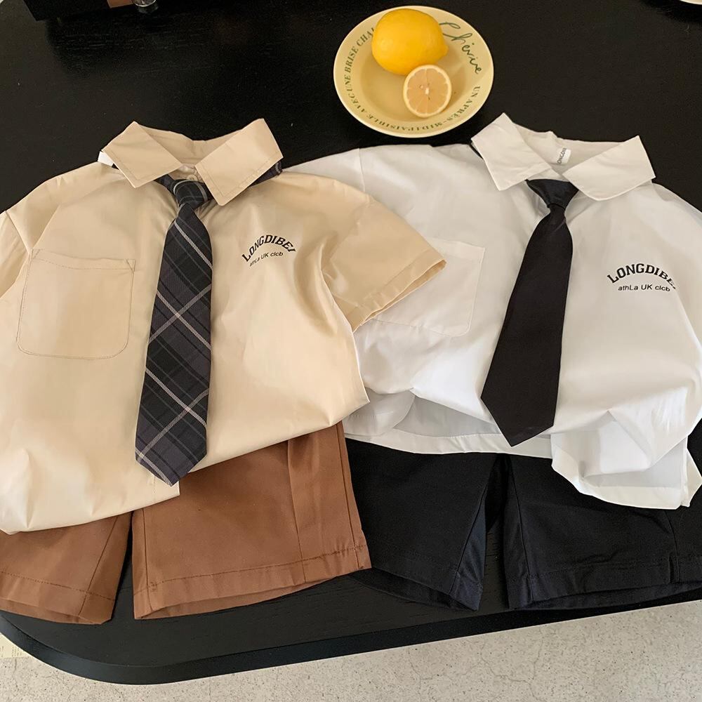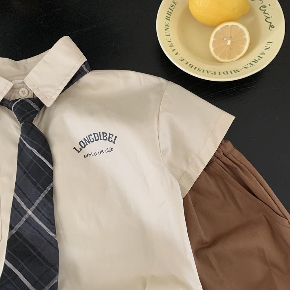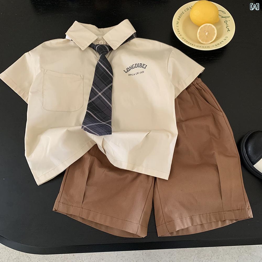 シャツ 子供用 半袖シャツ & 短パン 上下2点セット コットン混紡 学院風 フォーマル 深棕色 & ブラック