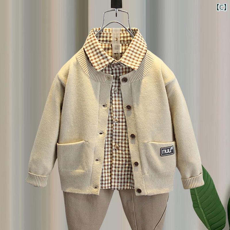 キッズ 男の子 春秋 3点セット 薄手 ニット カーディガン シャツ パンツ 上下セット 綿 カジュアル