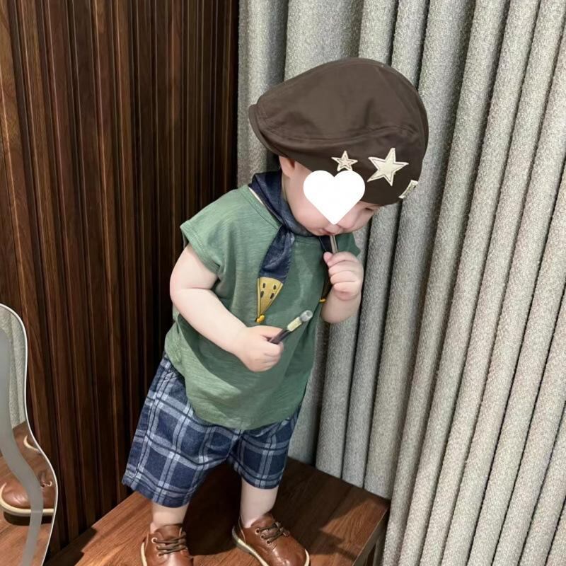 ・カラー: 緑背心+格子短パン【2点セット】, 緑色背心, 格子パンツ