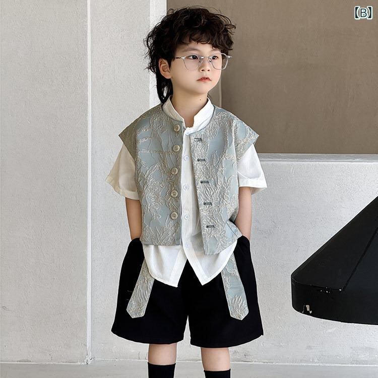 子供用 フォーマルウェア 春夏 半袖シャツ & ショートパンツ 上下セット 新中式 ベスト付き 男の子 薄手 3点セット 発表会 結婚式