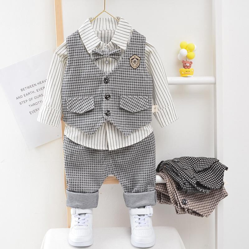 キッズ フォーマル スーツ 3点セット 春秋物 男の子 子供服 ブレザーズ パンツ ベスト付き 英国風 紳士 入園式 結婚式 グレー 格子柄 綿