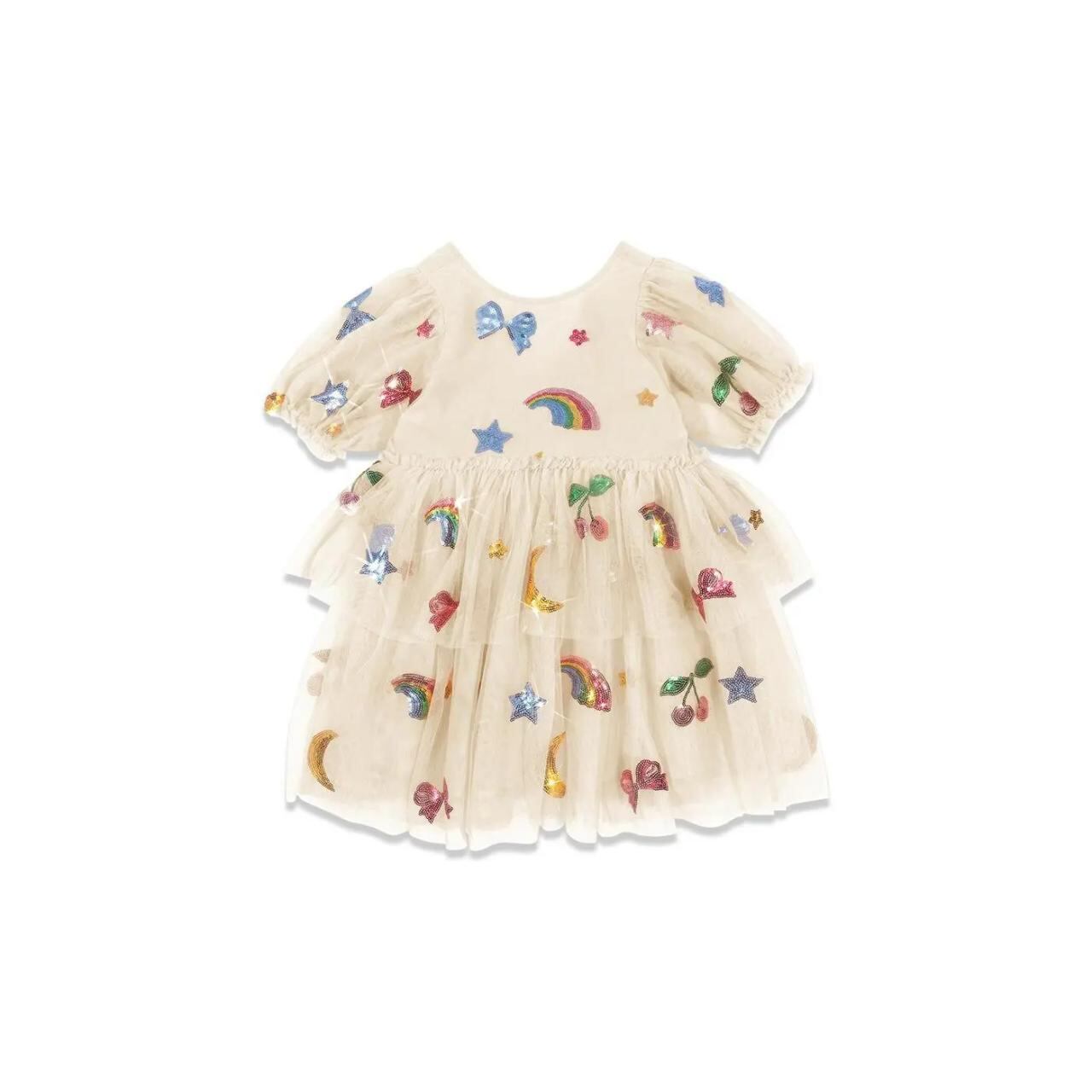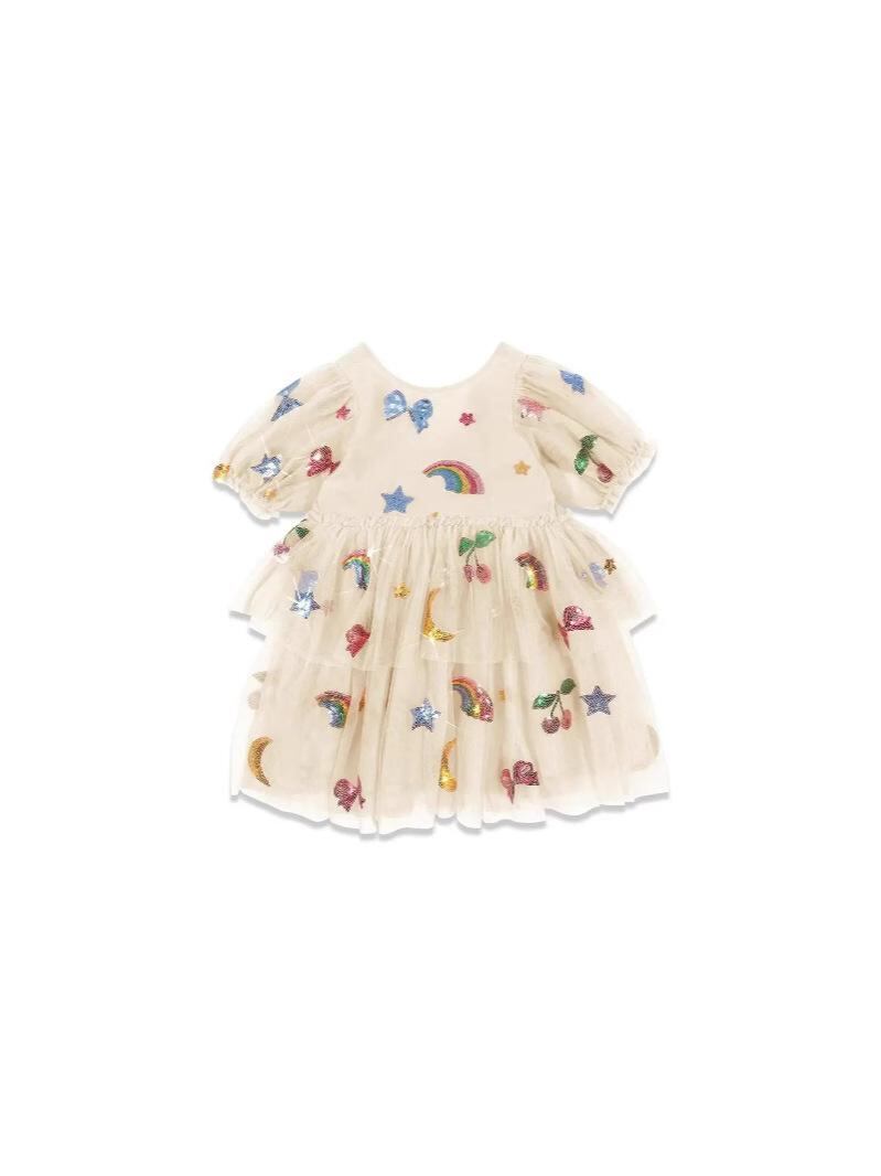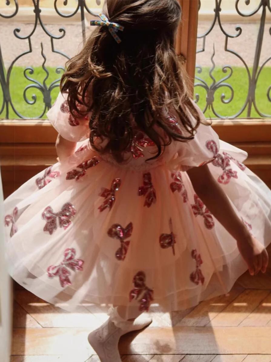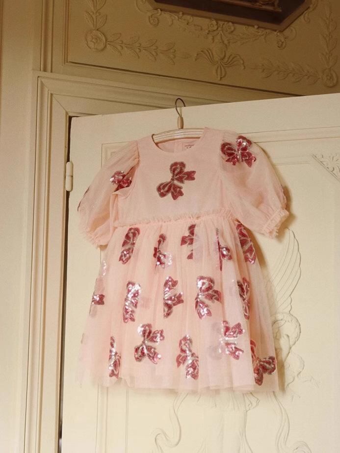 ワンピース キッズ 女の子 プリンセス かわいい 蝶結び スパンコール Aライン チュールスカート 夏 綿100% 90cm 100cm 110cm 120cm 130cm