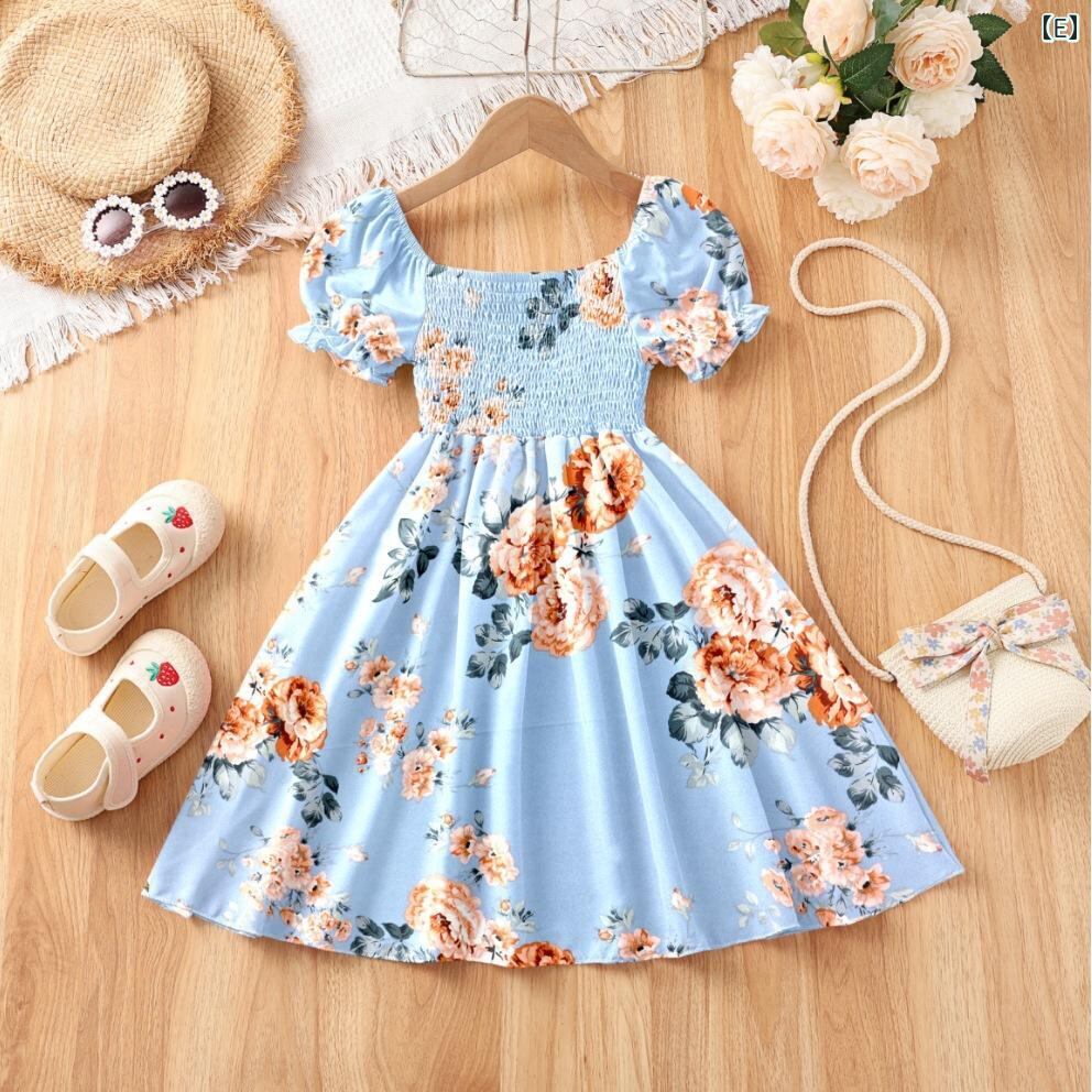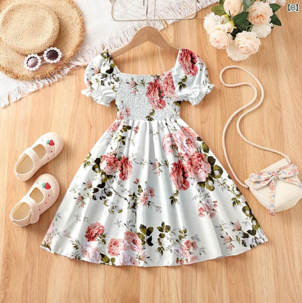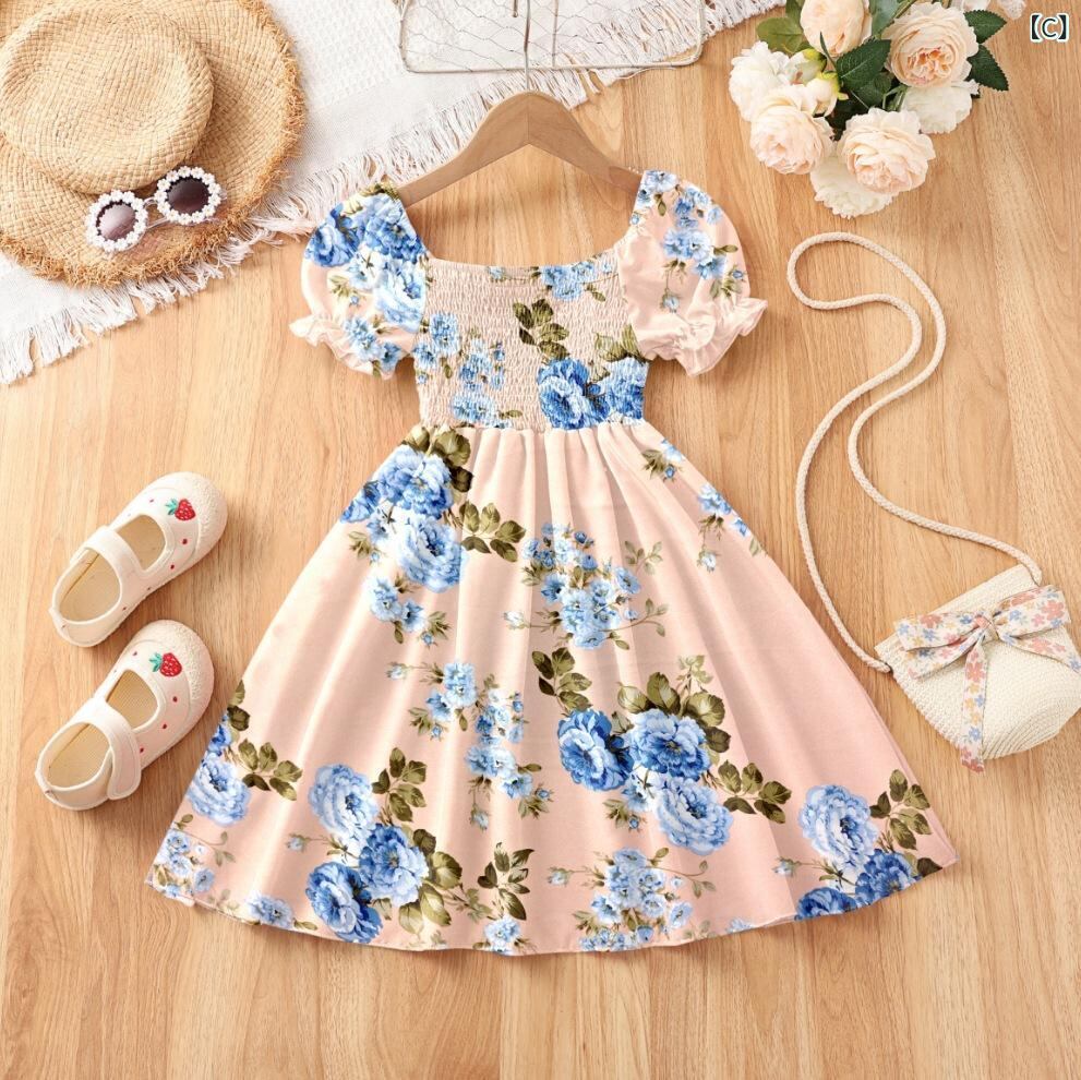 ワンピース キッズ 子供服 女の子 パフスリーブ 愛のハート柄 リボン付き 膝丈ワンピース Aライン プリンセススタイル かわいい おしゃれ ガーリー フェミニン お出かけ着 普段着 ポリエステル混紡 100cm 110cm 120cm 130cm 14