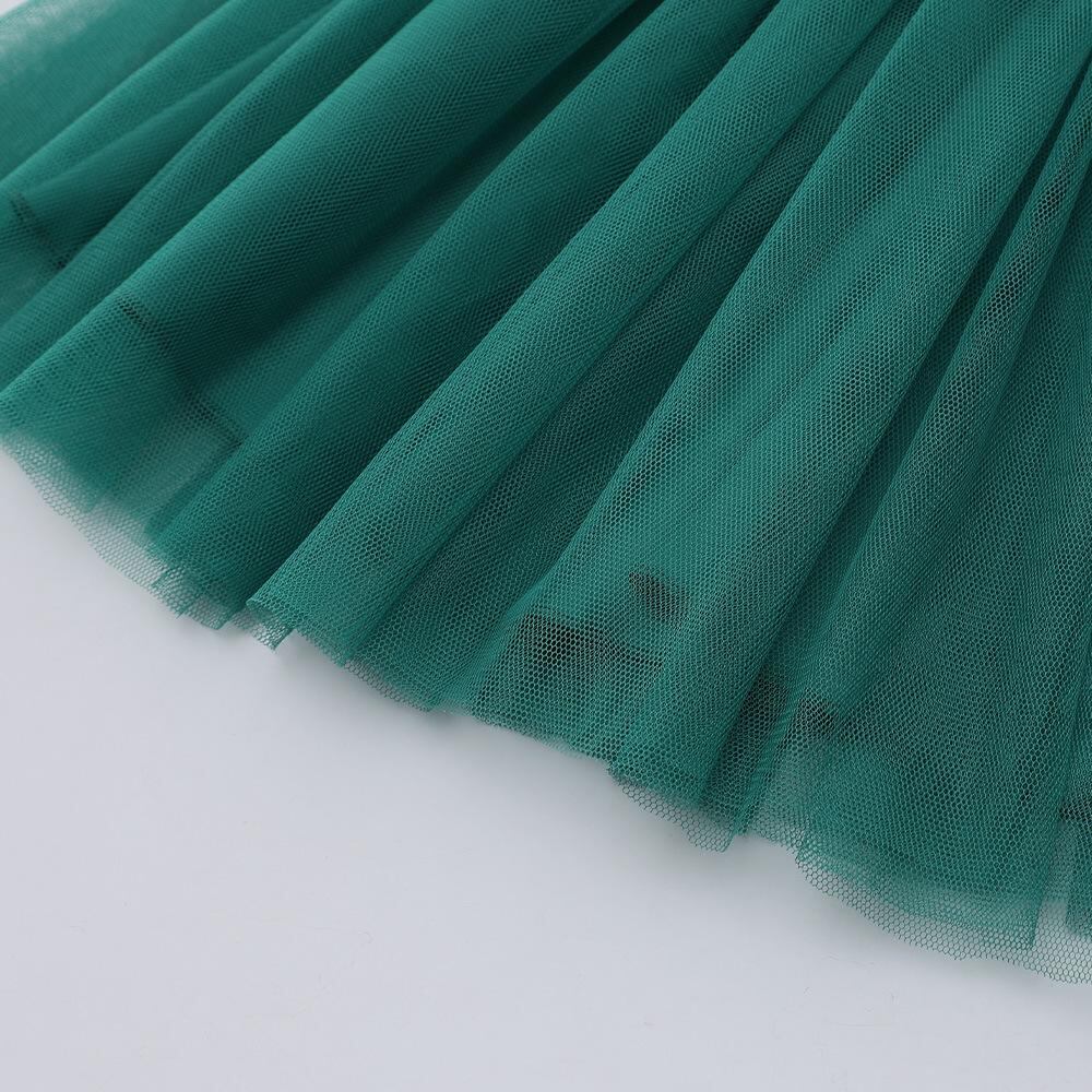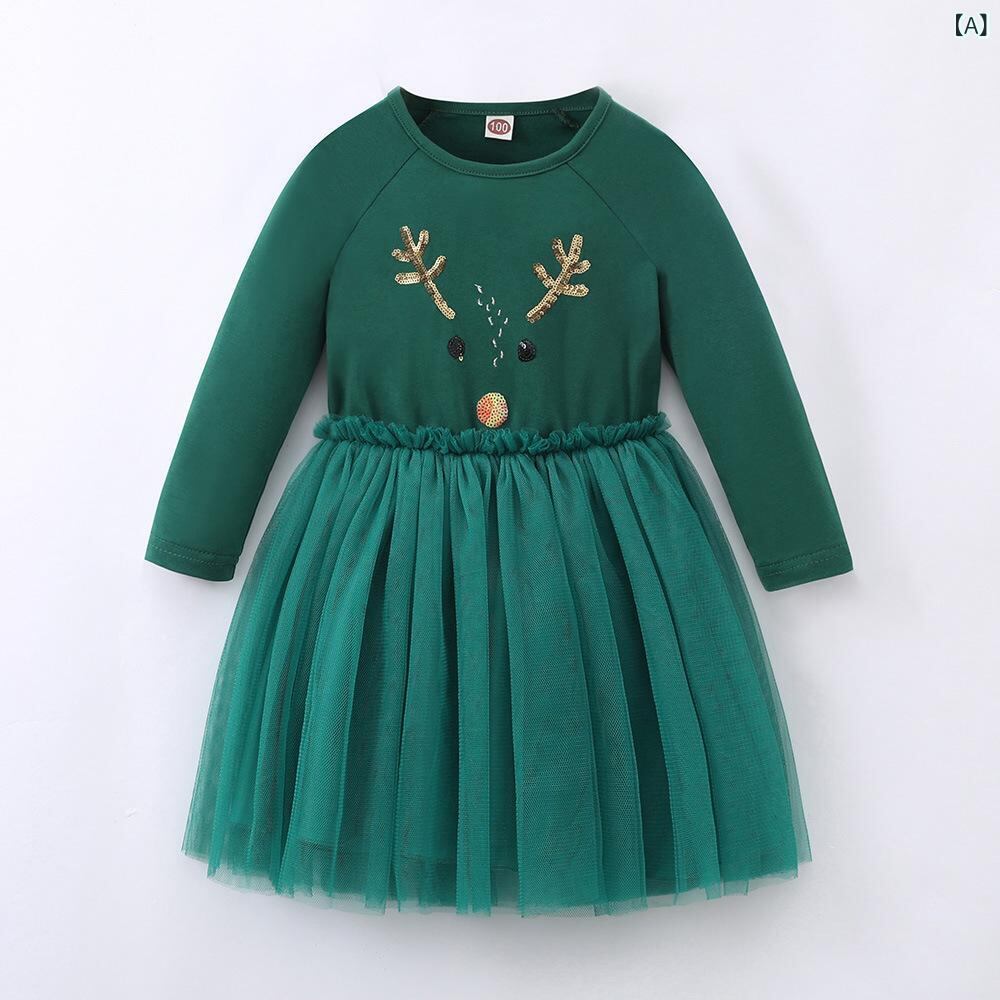 ワンピース 子供服 長袖 クリスマス チュールスカート 膝丈ワンピース かわいい トナカイ 刺繍 秋冬 グリーン レッド 100cm 110cm 120cm 130cm 140cm