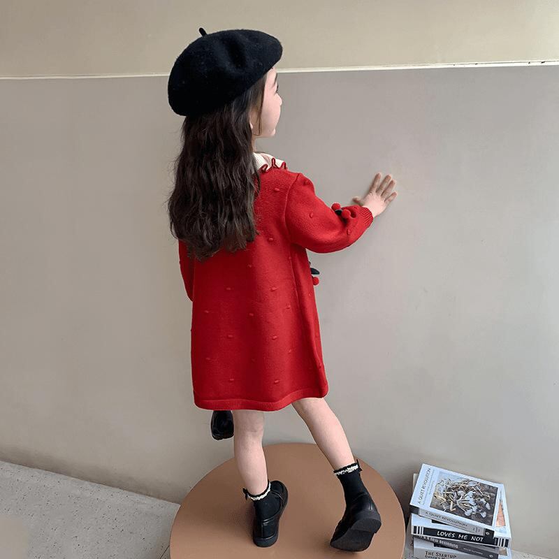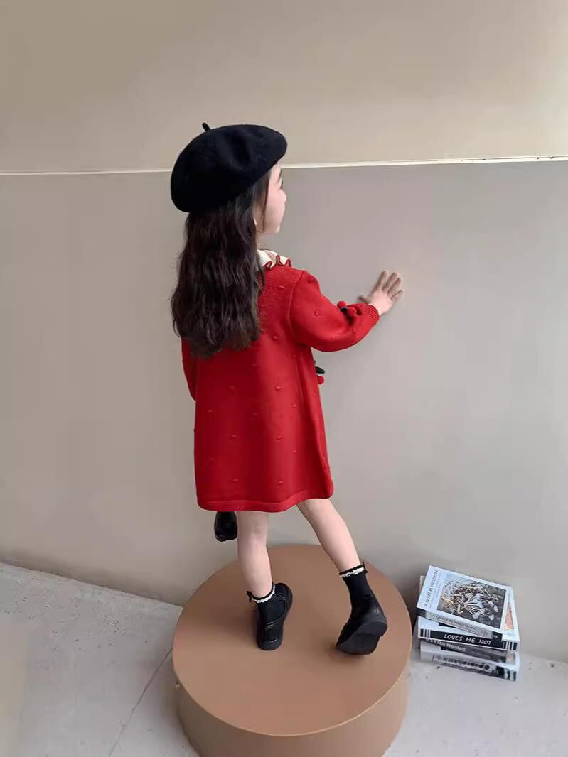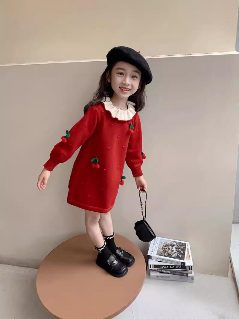 ワンピース 女の子 ニット 春秋 子供服 チュニック Aライン かわいい 立体 チェリー 赤色系