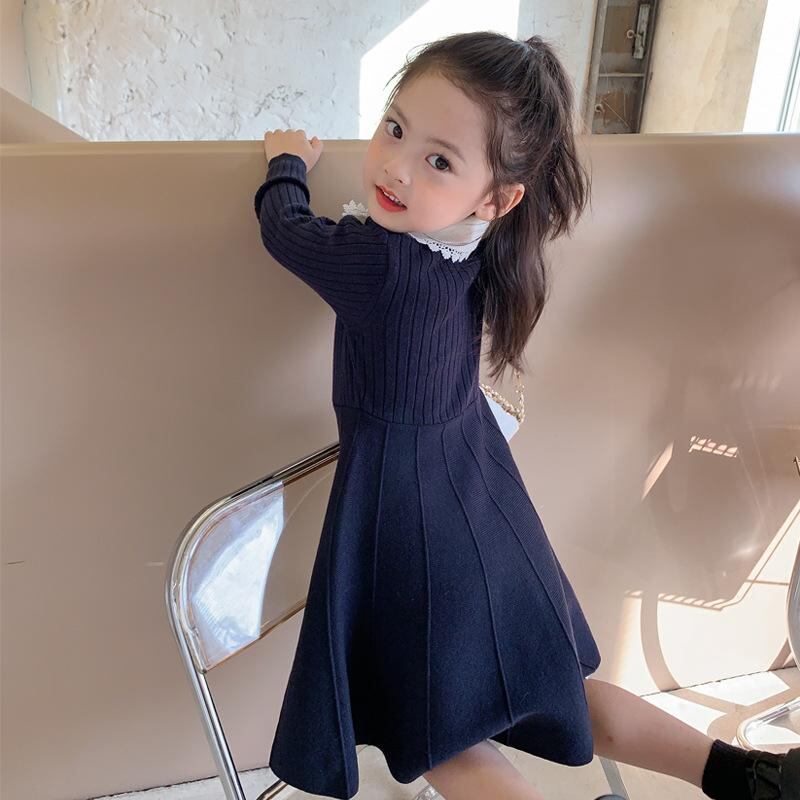 子供服 ワンピース 女の子 長袖 ニットワンピース 百褶スカート 学院風 春秋 発表会 普段着 かわいい 紺 90 100 110 120 130 140