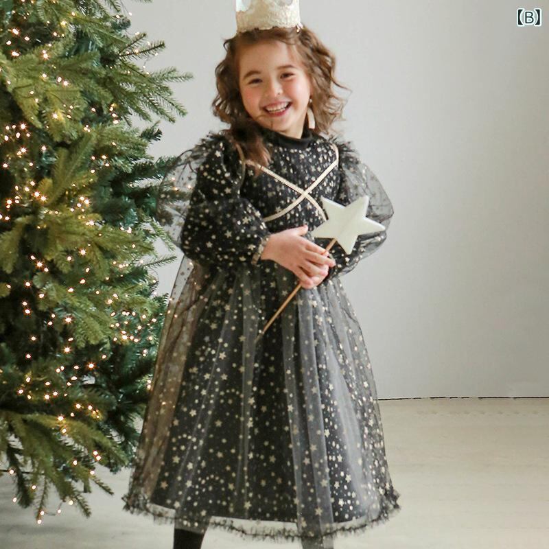 ワンピース キッズ 女の子 子供 クリスマス プリンセス スカート コットン 春秋 冬 長袖 星柄 ピンク系 ブラック系 アイボリー かわいい 普段使い