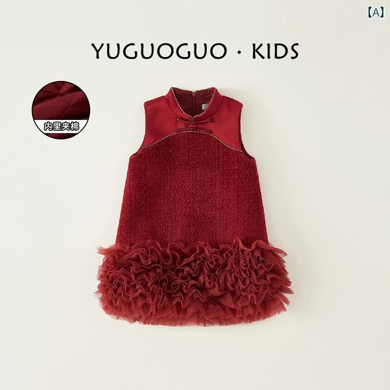 ワンピース 女の子 子供 チャイナドレス 秋冬 新年 赤色 発表会 演奏会 お正月 B類 吊りスカート ポリエステル Aライン かわいい 100cm 110cm 120cm 130cm 140cm 150cm 160cm