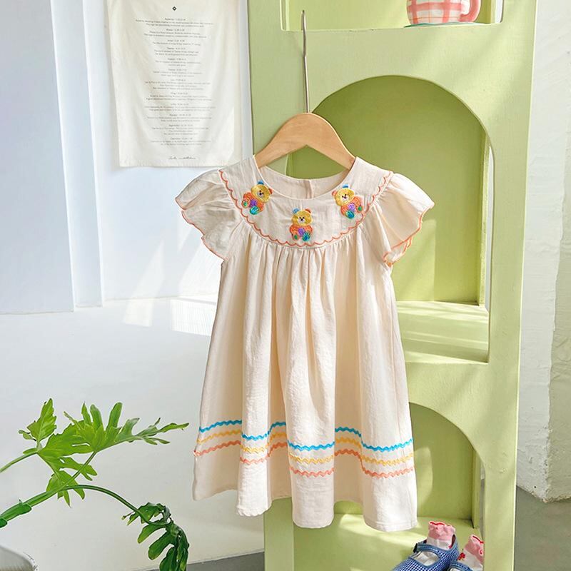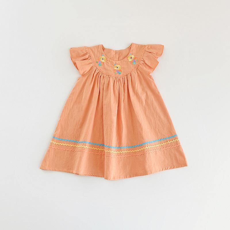 ワンピース キッズ 女の子 刺繍 レインボーベア コットン 春夏 半袖 Aライン 膝丈 かわいい 幼稚園 保育園 小学生 ガールズ 子供服 杏色