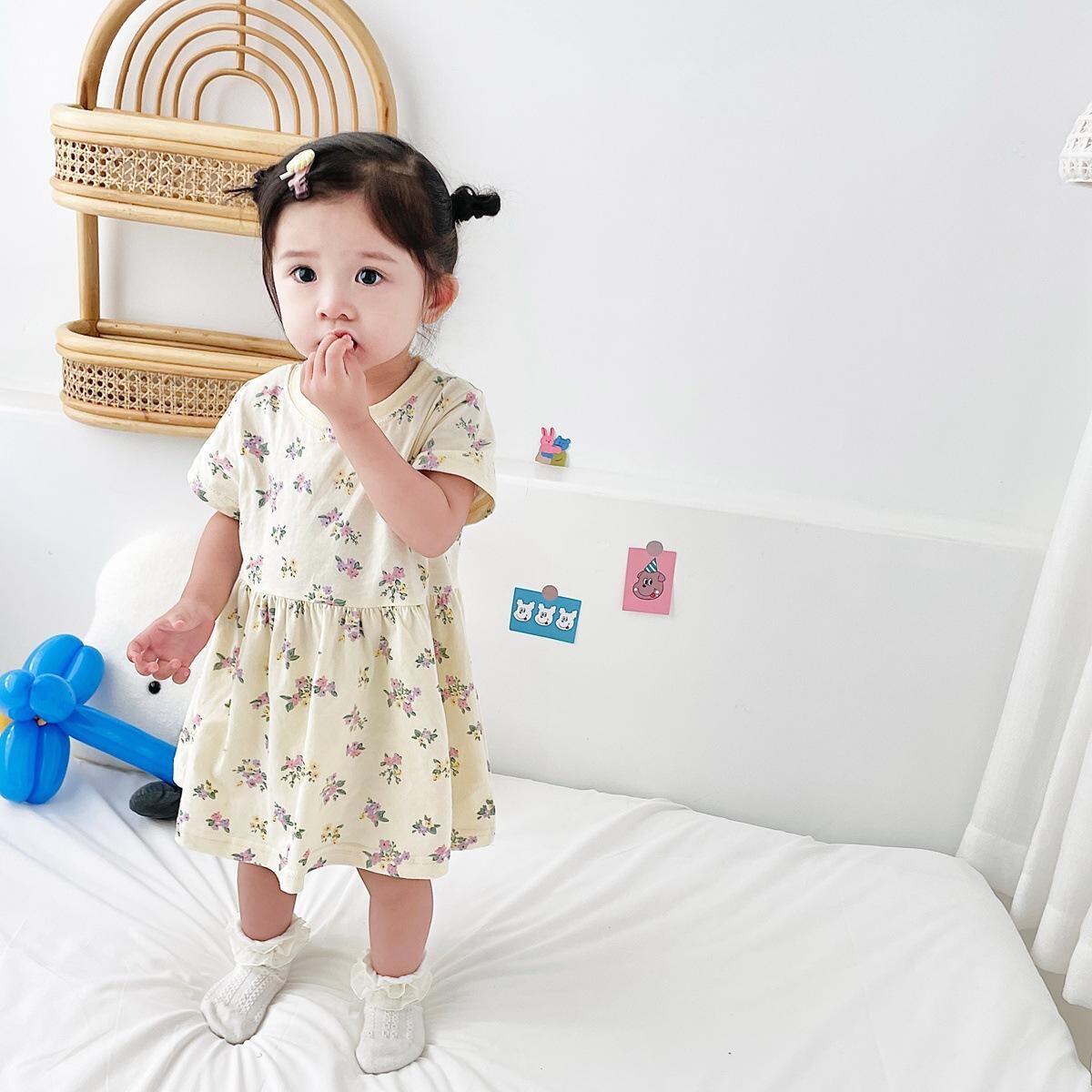 ワンピース 女の子 ベビー 子供服 チュニック 半袖 花柄 コットン 接触冷感 Aライン 幼児 普段着 かわいい 杏色 6-12m,12-18m,18-24m,2-3y,3-4y