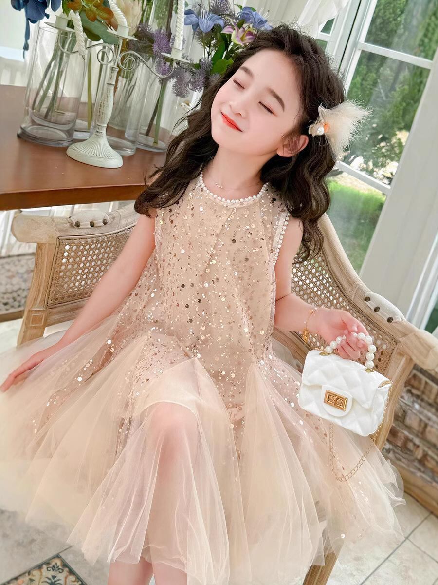 ワンピース キッズ 女の子 子供 夏服 背心 ノースリーブ レース チュール 魚尾 フィッシュテール スカート かわいい おしゃれ シャンパン ゴールド ドット 水玉 お出かけ イベント パーティー プリンセス