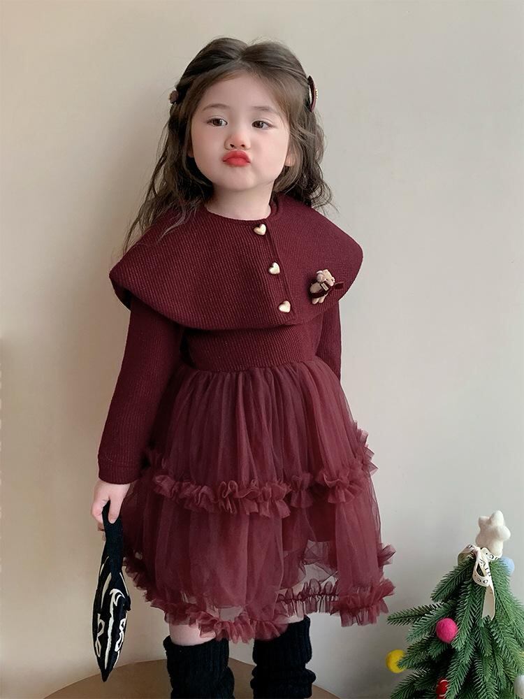 ワンピース キッズ 女の子 裏起毛 ショール付き Aライン プリンセス 普段着 お出かけ 防寒 かわいい ワインレッド