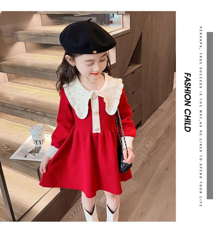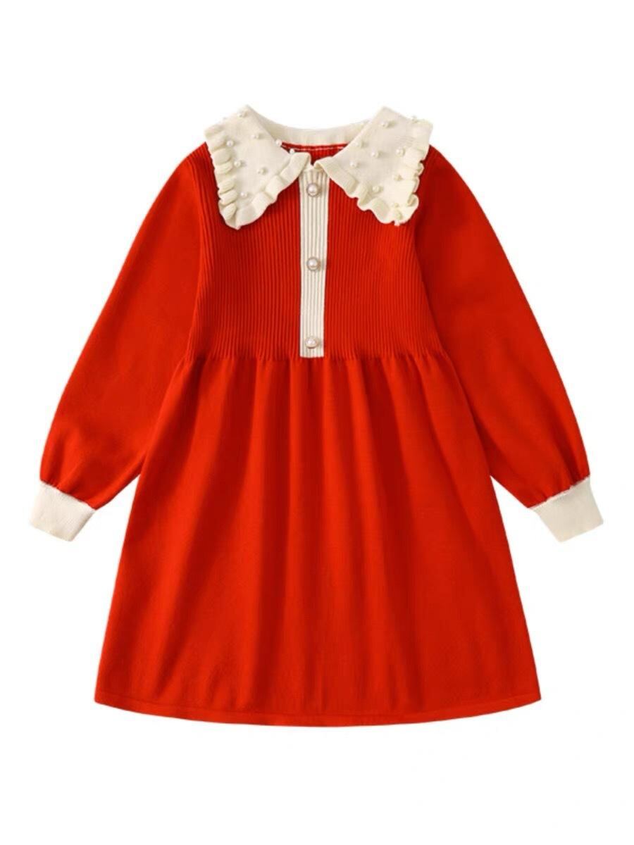 ワンピース キッズ 女の子 子供 長袖 秋冬 ニットワンピース Aライン プリンセス 襟付き かわいい おしゃれ レッド 発表会 結婚式 普段着