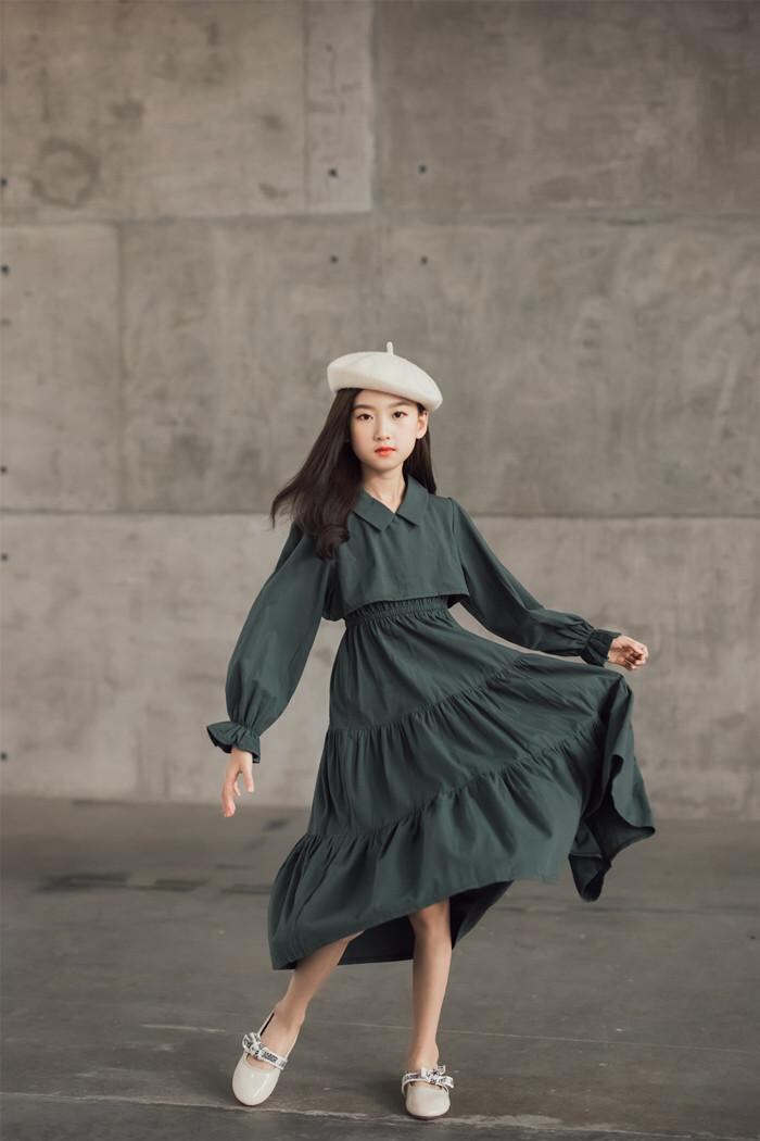 ワンピース キッズ 子供服 女の子 プリンセスドレス 長袖 Aライン 膝丈 ミドル丈 無地 かわいい おしゃれ 普段着 墨グリーン ブラック系 110cm 120cm 130cm 140cm 150cm 160cm
