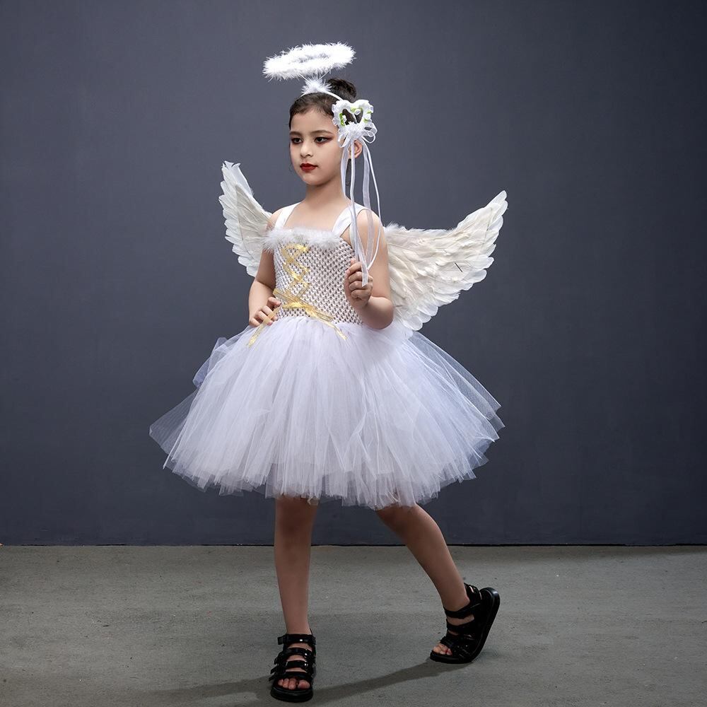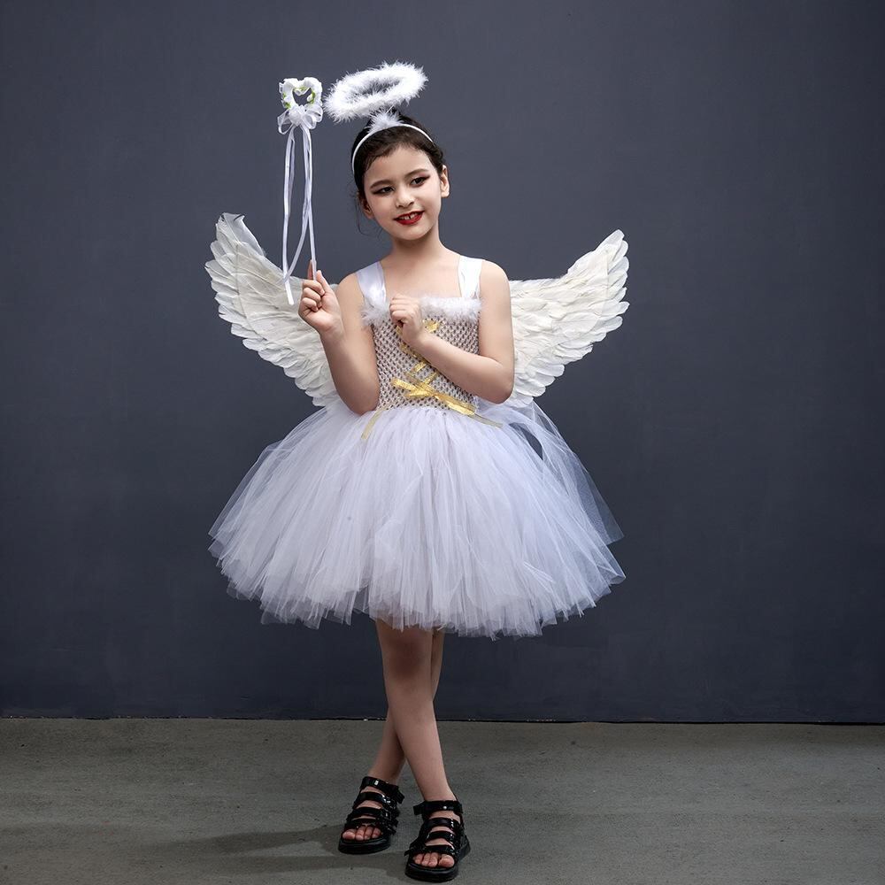 ワンピース 子供 女の子 白色天使 羽根 舞台 衣装 プリンセス チュールスカート 膝丈 ノースリーブ 発表会 演奏会 かわいい 3歳 4歳 5歳 6歳 7歳 8歳 9歳 10歳 11歳 12歳 幼稚園 小学生 卒業式 入学式 パーティー イベント ハロ