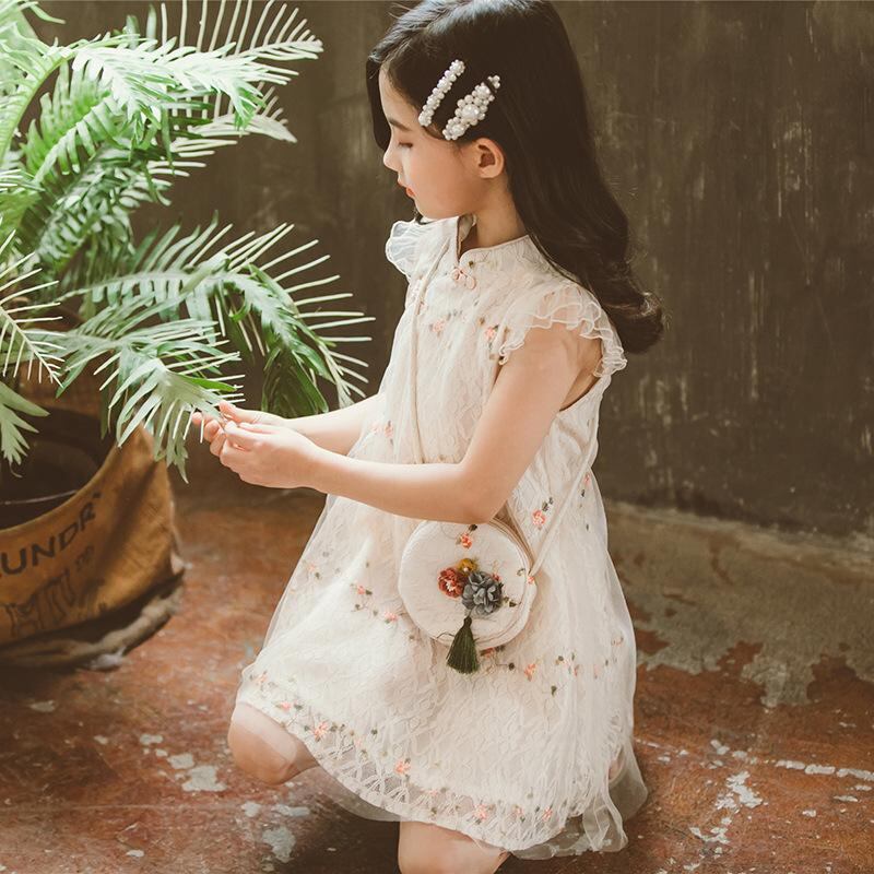ワンピース キッズ 女の子 チャイナドレス レース スカート 子供服 ミドル丈 ビッグシルエット 花柄 コットン混紡 かわいい 普段使い 発表会 110cm 120cm 130cm 140cm 150cm 160cm グリーン アイボリー