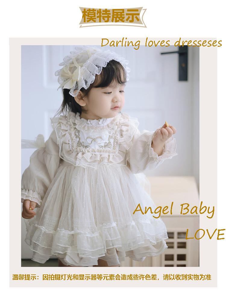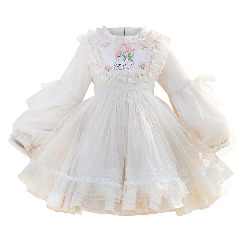 ワンピース 子供 女の子 ロリータ プリンセス レース チュールスカート 誕生日 パーティー ドレス 長袖 コットン かわいい 8歳以上 ベージュ系