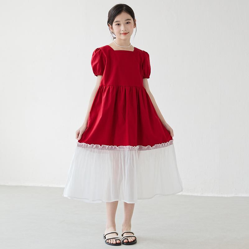 ワンピース キッズ 女の子 子供服 半袖 夏服 魚尾スカート ロングスカート 切り替え レッド かわいい コットン