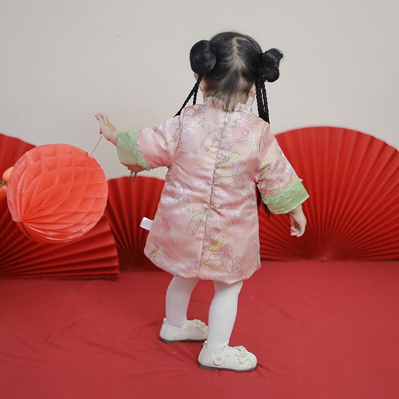 ワンピース 女児 チャイナドレス 秋冬 裏起毛 中国風 花柄 かわいい ベビー 礼服 長袖 Aライン 73 80 90 100 110 120 ピンク系 ポリエステル